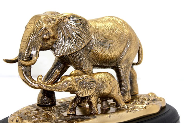 Pirinç malzemeden üretilmiş bu zarif fil bibloları, büyüleyici bir tasarıma sahip olup, anne ve yavru fili simgelemektedir. 35x20 cm boyutunda olan bu obje, altın rengiyle zarif bir görünüm sunar. Hem evde hem ofiste şık bir dekorasyon parçası olarak kullanılabilir. Fil figürü, sevgi ve bağlılık sembolü olarak popüler bir koleksiyonluk parça olmasının yanı sıra, hediye olarak da oldukça idealdir.