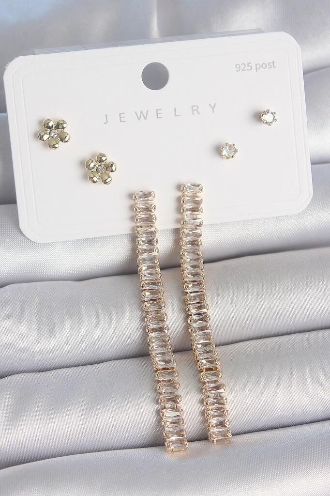 Pirinç Gold Renk Su Yolu Zirkon Taşlı Sallantı Model Çiçek Detay 925 Ayar Gümüş Çivi Kadın Küpe Seti - BKP10496 (491491)