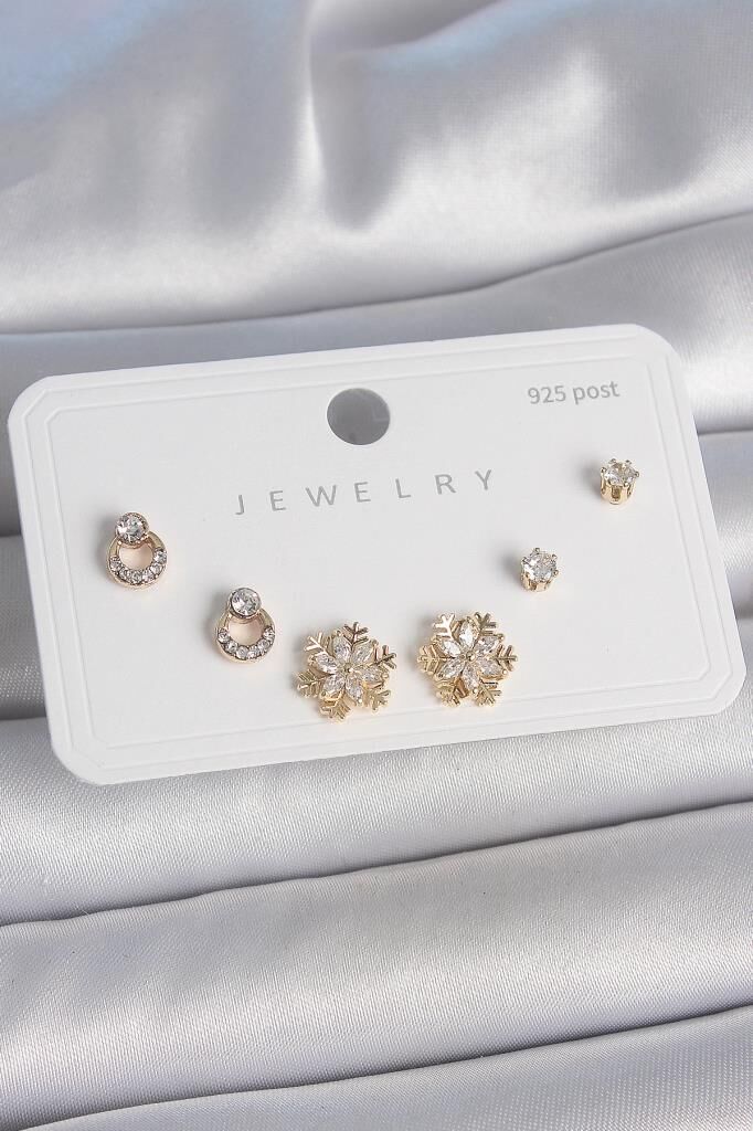 Pirinç Gold Renk Zirkon Taşlı Kar Tanesi Model 925 Ayar Gümüş Çivi Kadın Küpe Seti - BKP10482 (491491)
