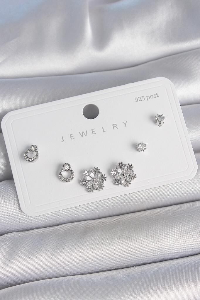 Pirinç Gümüş Renk Zirkon Taşlı Kar Tanesi Model 925 Ayar Gümüş Çivi Kadın Küpe Seti - BKP10483 (491491)