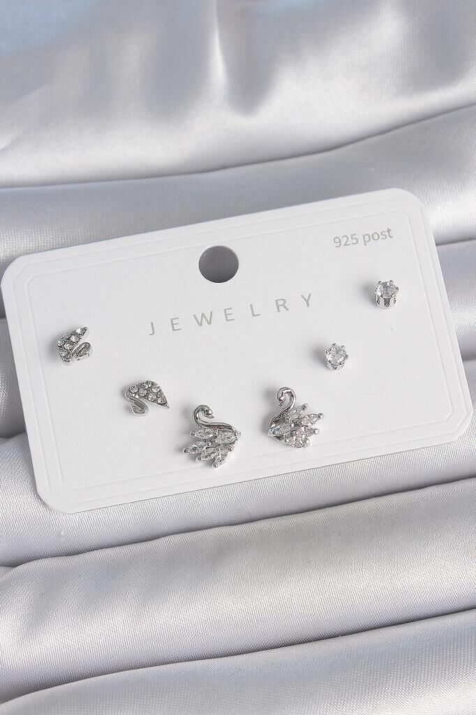 Pirinç Gümüş Renk Zirkon Taşlı Kuğu Model 925 Ayar Gümüş Çivi Kadın Küpe Seti - BKP10481 (491491)