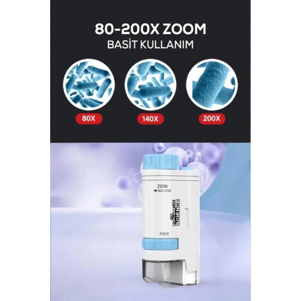 Portatif mini mikroskop, 10.5 cm x 5 cm x 3 cm boyutlarıyla kompakt ve taşınabilir bir kullanım sunar. 80x ila 200x arasında yakınlaştırma yapabilen zoom özelliği sayesinde detayları net şekilde inceleme imkânı sağlar. Dahili LED aydınlatması sayesinde karanlık ortamlarda bile net görüntü elde edilebilir. Üzerindeki odaklama ve yakınlaştırma ayar düğmeleriyle görüntü kontrolü kolayca yapılabilir. El tipi tasarımı ile okul projeleri, doğa gözlemleri, hobi ve eğitim amaçlı kullanımlar için idealdir. Hafif yapısı sayesinde çantada taşınabilir ve istenilen her yerde anında kullanılabilir. Çocuklar ve yetişkinler için eğlenceli ve öğretici bir üründür.