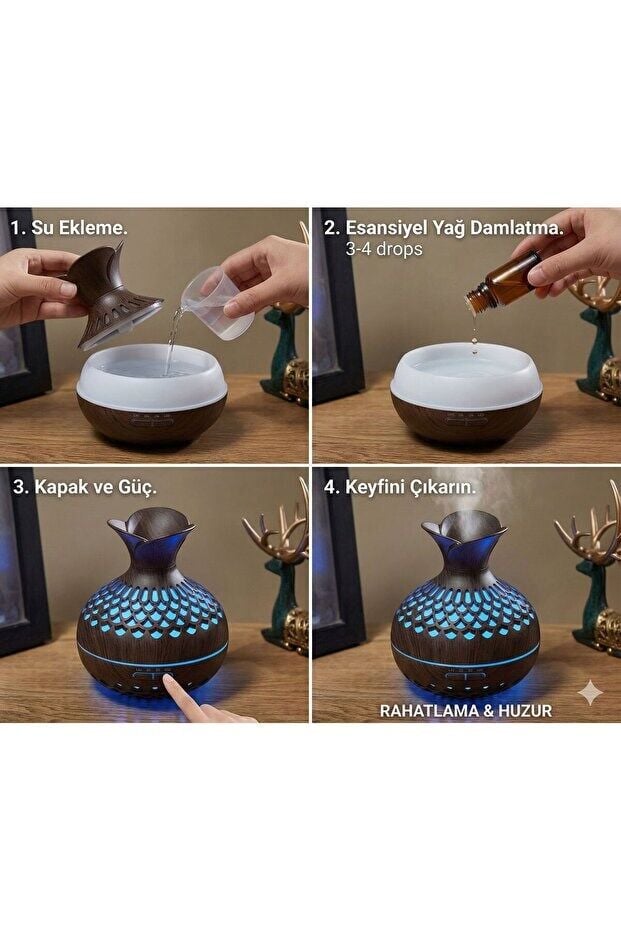 Bu aromaterapi difüzör ve hava nemlendirici, evinizde, ofisinizde veya yoga stüdyonuzda rahatlatıcı bir atmosfer yaratmak için mükemmel bir seçimdir. Hem fonksiyonel hem de dekoratif özellikleriyle yaşam kalitenizi artırır.