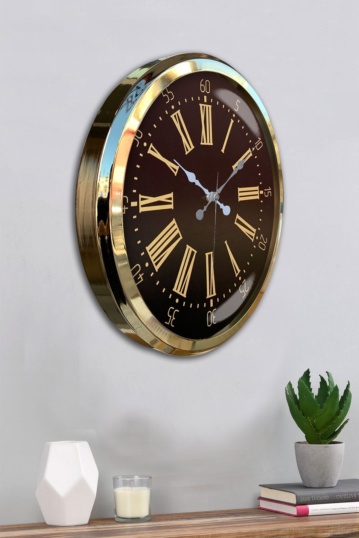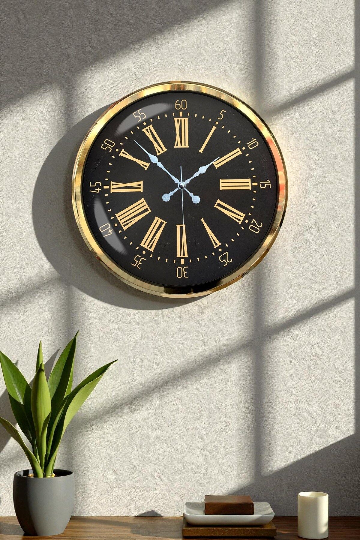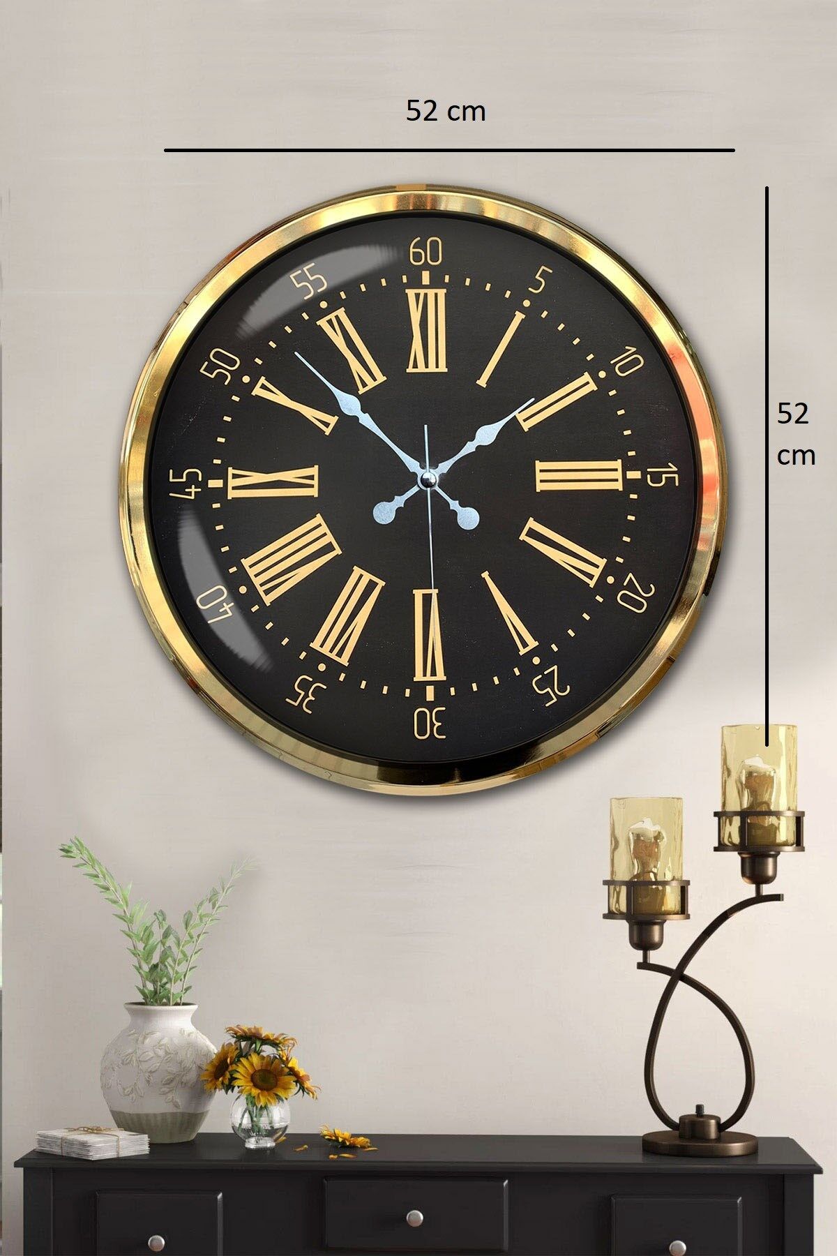 Geniş ölçüsü ve göz alıcı gold çerçevesiyle öne çıkan bu 52 x 52 cm büyük duvar saati, modern ve şık tasarımıyla ev ve iş yerlerine zarif bir dokunuş katar. Ön yüzeyinde yer alan gerçek cam kaplama, saatin hem daha parlak hem de daha dayanıklı olmasını sağlar. Sessiz çalışan mekanizması ile tik-tak sesi olmadan huzurlu bir ortam sunar. Büyük kadranı ve net rakamları sayesinde uzaktan bile rahatlıkla okunabilir. Salon, ofis, mutfak, çalışma odası, kafe ve geniş alanlar için ideal bir dekoratif üründür.