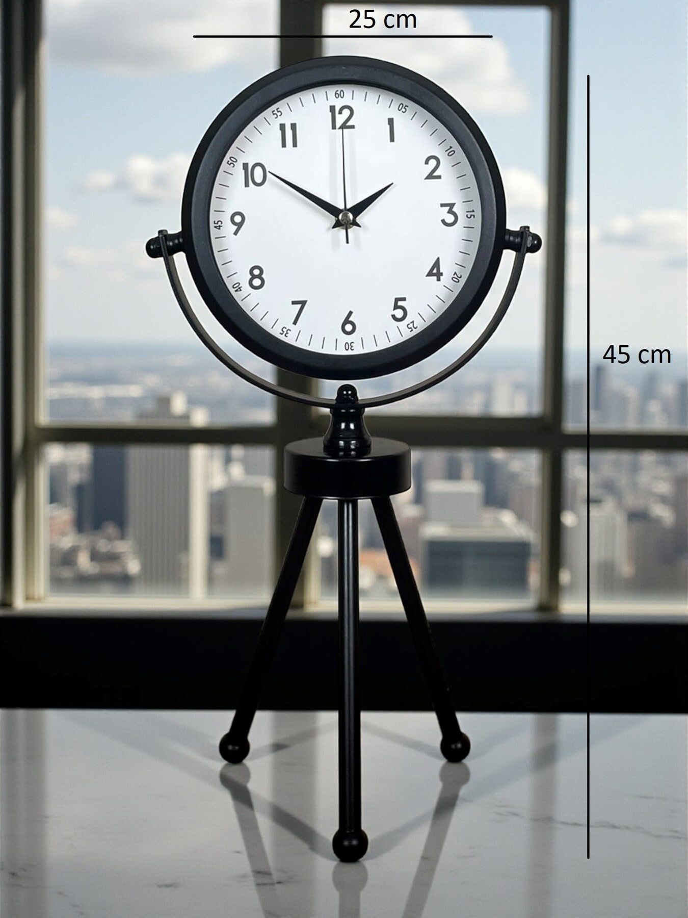 45 x 25 cm ölçülerindeki bu modern siyah üç ayaklı masa saati, minimal tasarımı ve güçlü duruşuyla her ortama şıklık katar. Gerçek cam korumalı kadranı sayesinde net görüntü ve uzun ömürlü kullanım sağlar. Tamamen metal gövdesi ve tripod ayak yapısıyla sağlam, dekoratif ve premium bir görünüm sunar. Sessiz akar saniye mekanizmasıyla ev, ofis ve çalışma alanlarında rahatsızlık vermeden kullanılabilir.