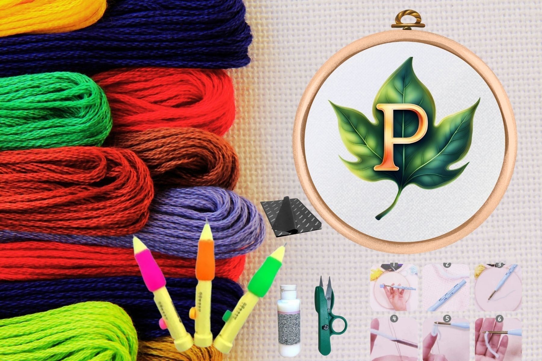 Punch seti, punch nakışı yapmayı öğrenmek veya bu hobiyi sürdürmek isteyenler için eksiksiz bir başlangıç paketi sunar. Punch seti, aşağıdaki malzemeleri içerir: