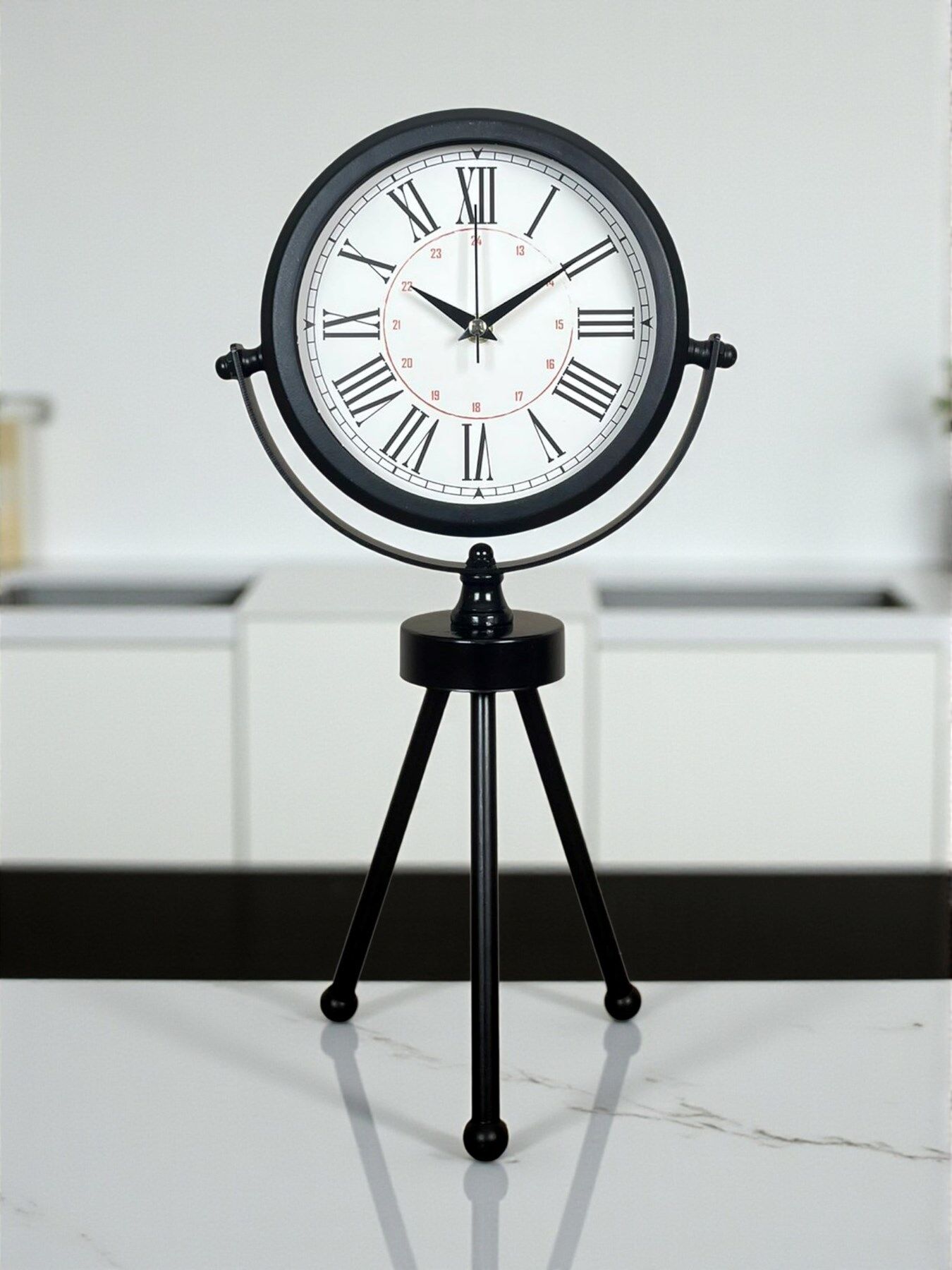 45 x 25 cm ölçülerindeki bu modern siyah üç ayaklı masa saati, minimal tasarımı ve güçlü duruşuyla her ortama şıklık katar. Gerçek cam korumalı kadranı sayesinde net görüntü ve uzun ömürlü kullanım sağlar. Tamamen metal gövdesi ve tripod ayak yapısıyla sağlam, dekoratif ve premium bir görünüm sunar. Sessiz akar saniye mekanizmasıyla ev, ofis ve çalışma alanlarında rahatsızlık vermeden kullanılabilir.
