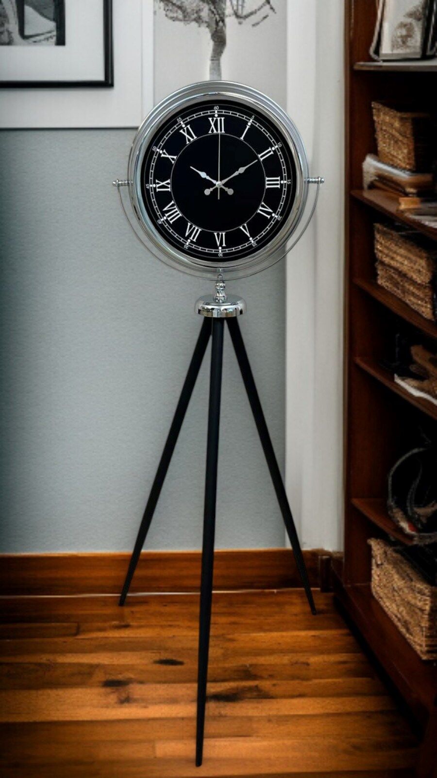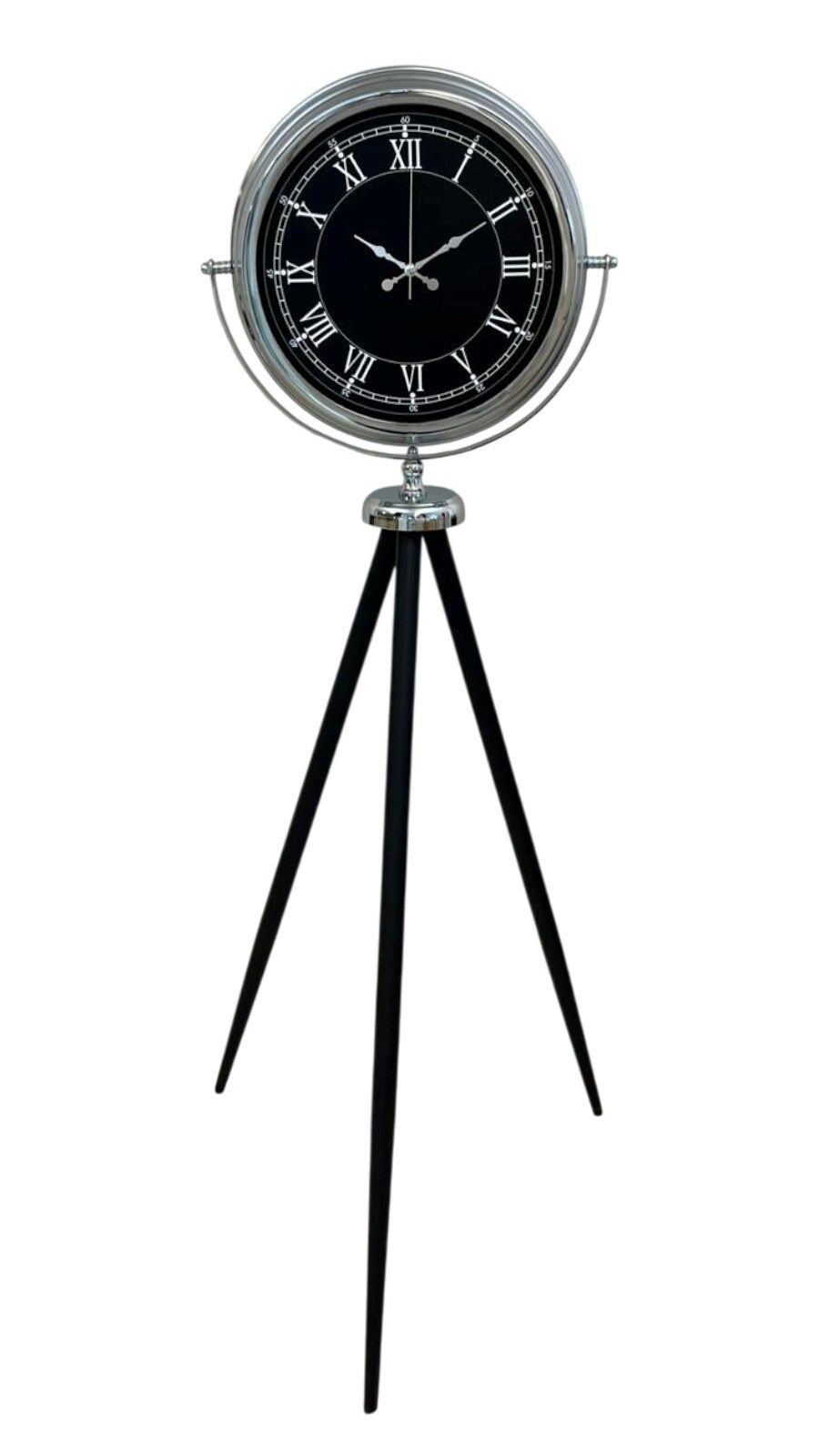 Zamanı yalnızca göstermekle kalmayıp bulunduğu ortama güçlü bir karakter kazandıran bu krom tripod ayaklı dekoratif saat, klasik Roma rakamlı kadranı ve modern tripod formu ile dikkat çeken özel bir tasarımdır. 150 cm yüksekliği sayesinde mekânda ilk bakışta fark edilen bu model; salon, ofis, lobi, otel, mağaza ve prestijli yaşam alanları için sıradan saatlerden çok daha fazlasını sunar.