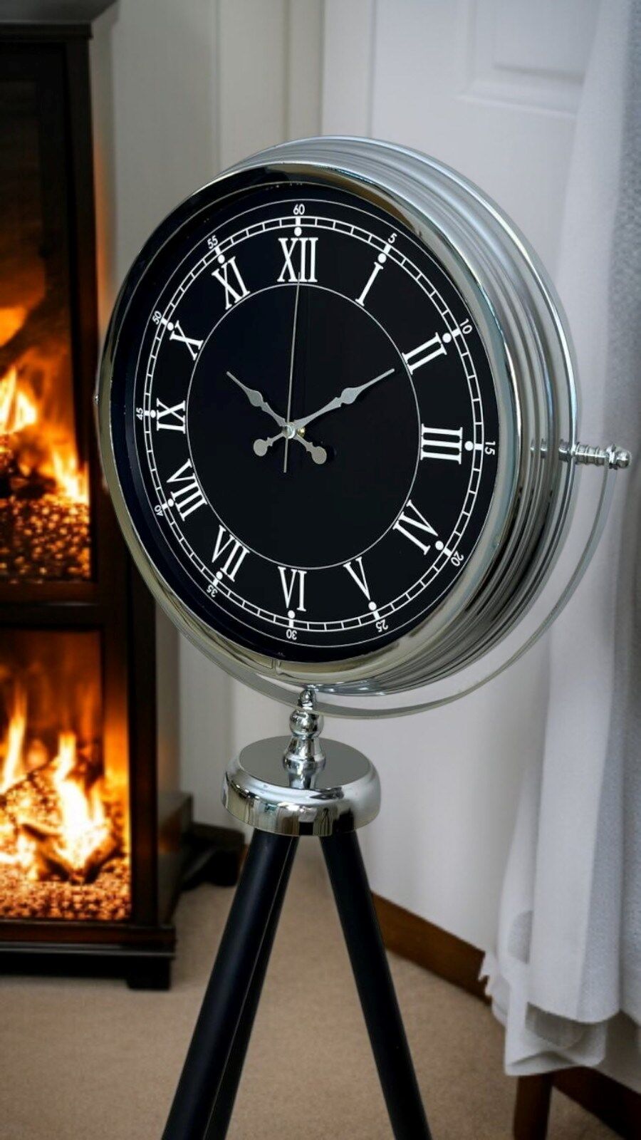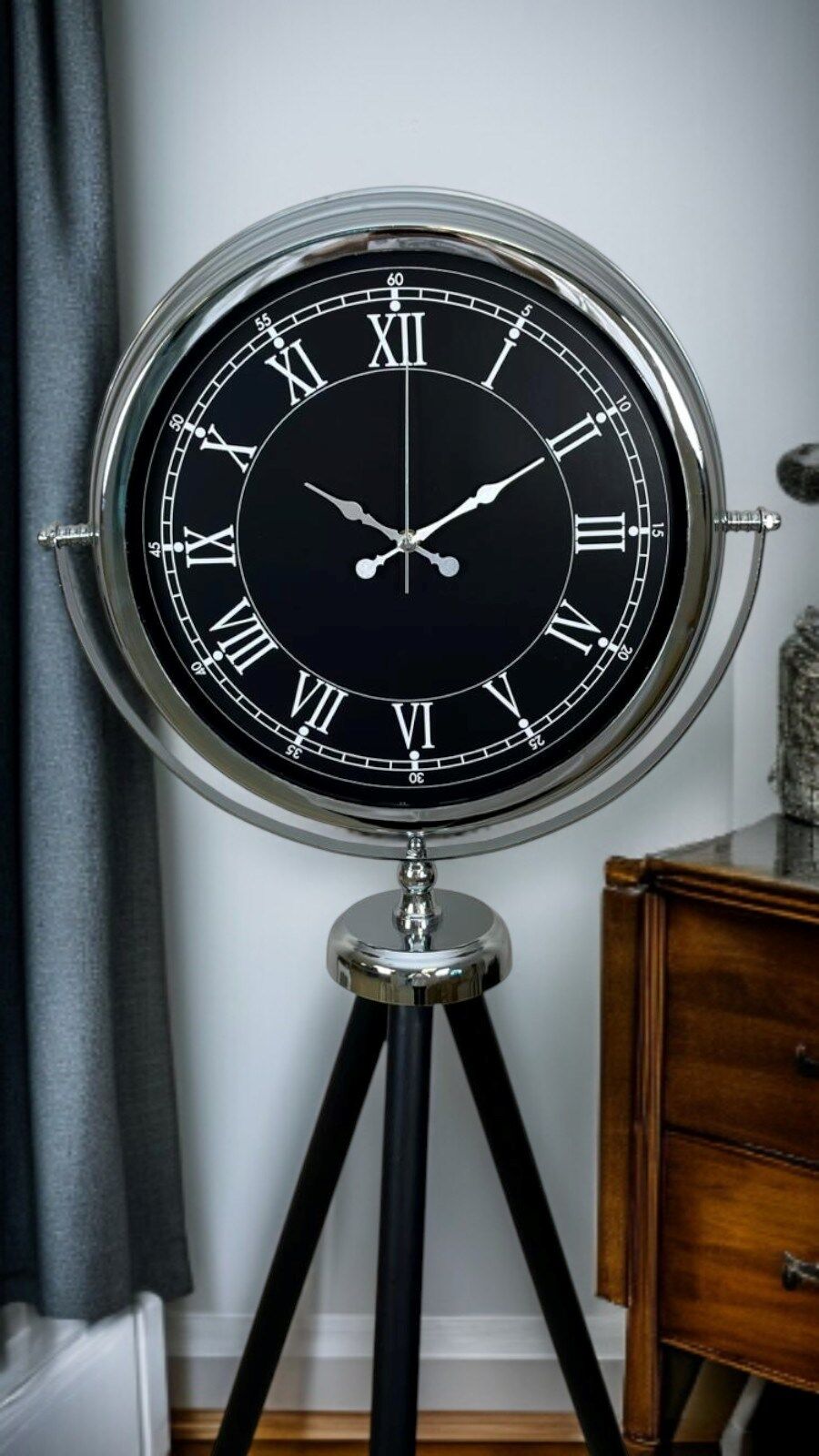 Parlak krom metal kasası, siyah kadran üzerindeki Roma rakamları ile birleşerek zamansız ve asil bir görünüm oluşturur. Dengeli tripod ayak yapısı, saatin hem sağlam hem de estetik bir duruş sergilemesini sağlar. Bu model, klasik detayları sevenler kadar modern dekorasyona değer katanlar için de ideal bir seçimdir.