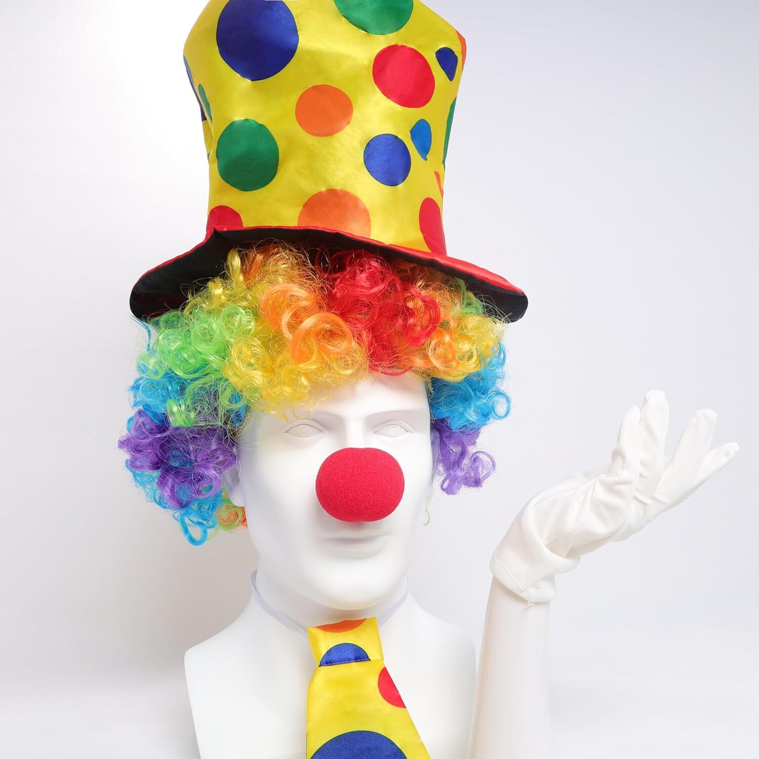 1 Adet Renkli Palyaço Kostüm Seti – 5 Parça Aksesuar (Şapka, Peruk, Kravat, Eldiven, Burun)