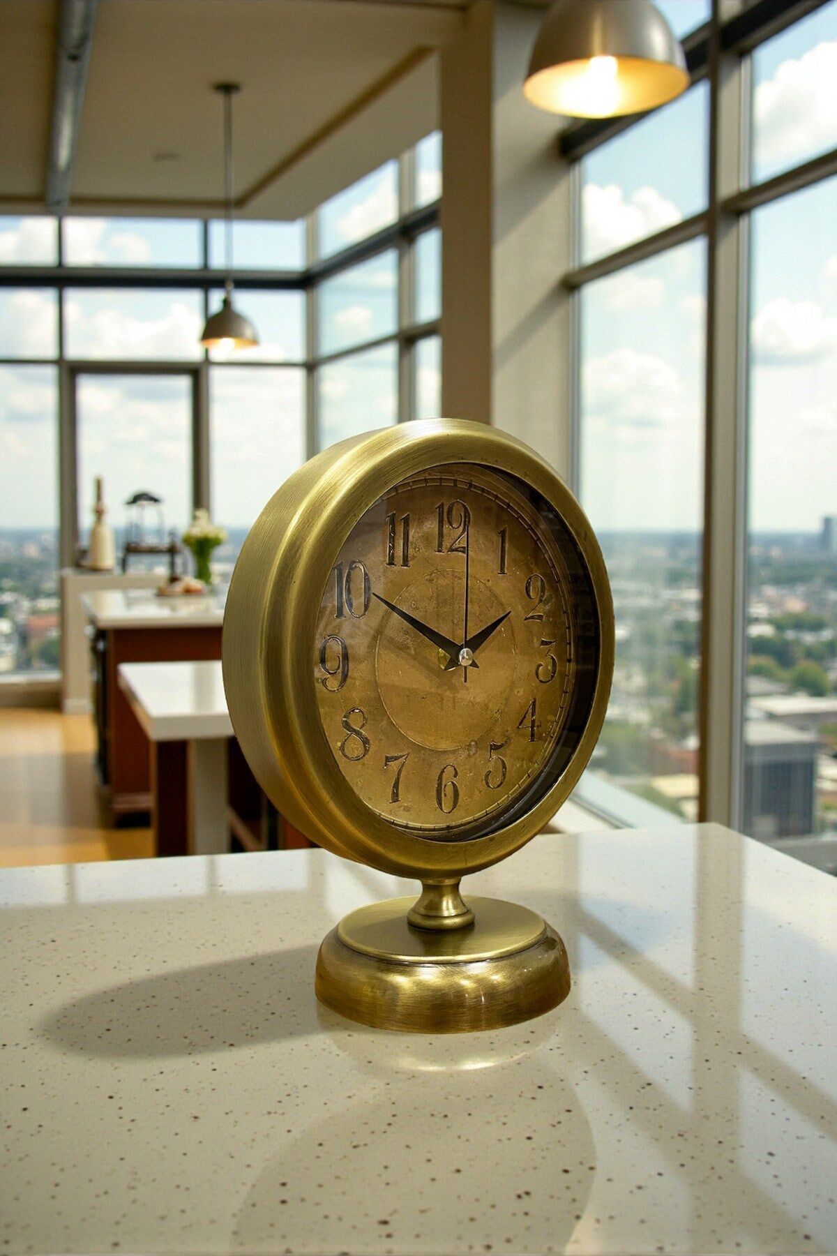 Zamana meydan okuyan tasarımıyla dikkat çeken bu eskitme vintage masa saati, bakır tonlu kadranı ve klasik rakamlarıyla nostaljik bir atmosfer yaratır. Retro dokusu, geçmişin estetiğini modern yaşam alanlarına taşıyarak bulunduğu ortamda sıcak ve karakterli bir görünüm sunar. Eskitme metal gövdesiyle hem dekoratif hem de dayanıklı bir yapı sergiler.