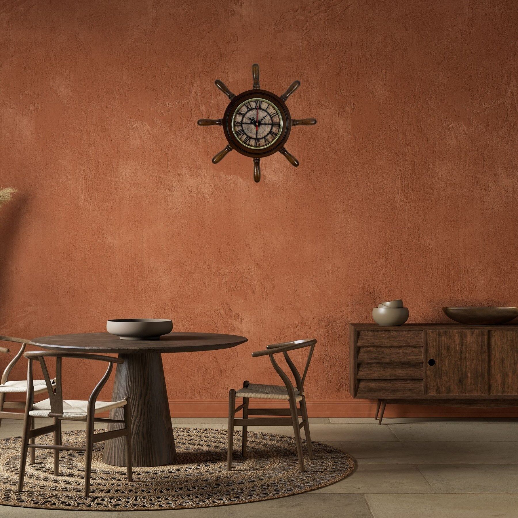 Eskitme ahşap görünümlü gövdesi ve dümen formundaki kavelaları sayesinde özellikle deniz temalı dekorasyonlarda, yazlık evlerde, teknelerde, restoranlarda, kafelerde ve salon dekorasyonlarında dikkat çekici bir dekoratif obje olarak öne çıkar. Şık tasarımı sayesinde hem fonksiyonel bir saat hem de güçlü bir dekoratif aksesuar olarak kullanılabilir.