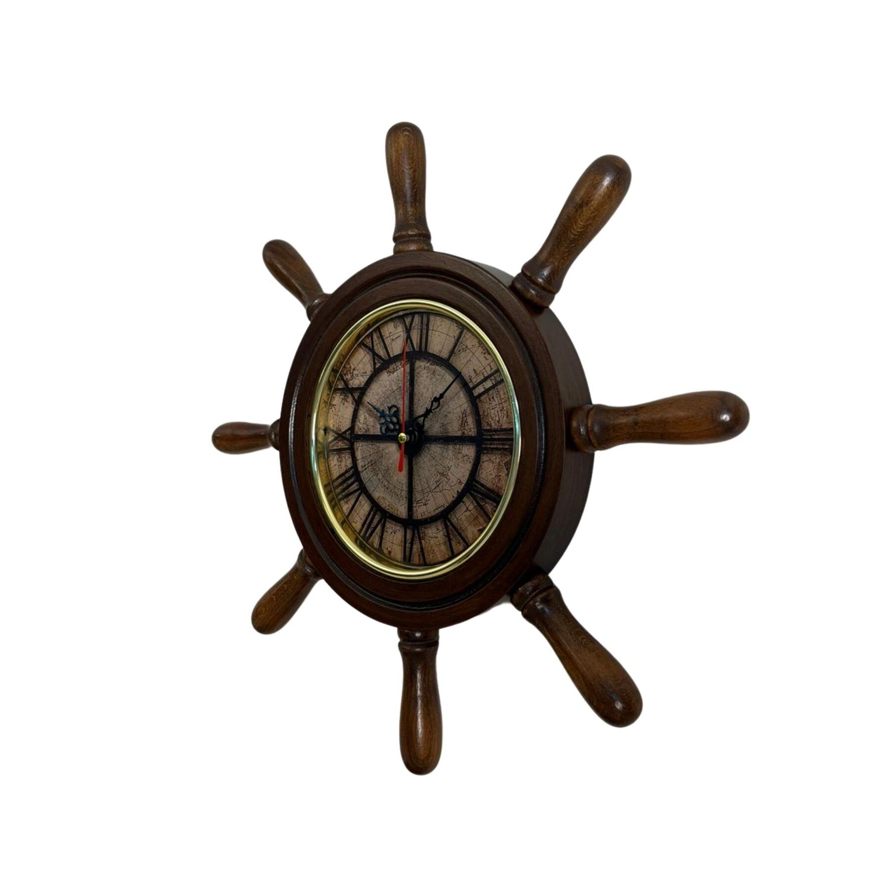 Saatin etrafında bulunan dümen kolları (kavelalar), gerçek bir gemi dümenini andıran detaylı bir tasarıma sahiptir. Bu kavelalar 8 cm uzunluğunda olup saatin marin karakterini güçlendiren estetik bir görünüm sunar. Saat kısmının çapı ise 37 cm olup duvar üzerinde dengeli ve dikkat çekici bir ölçü sunar.