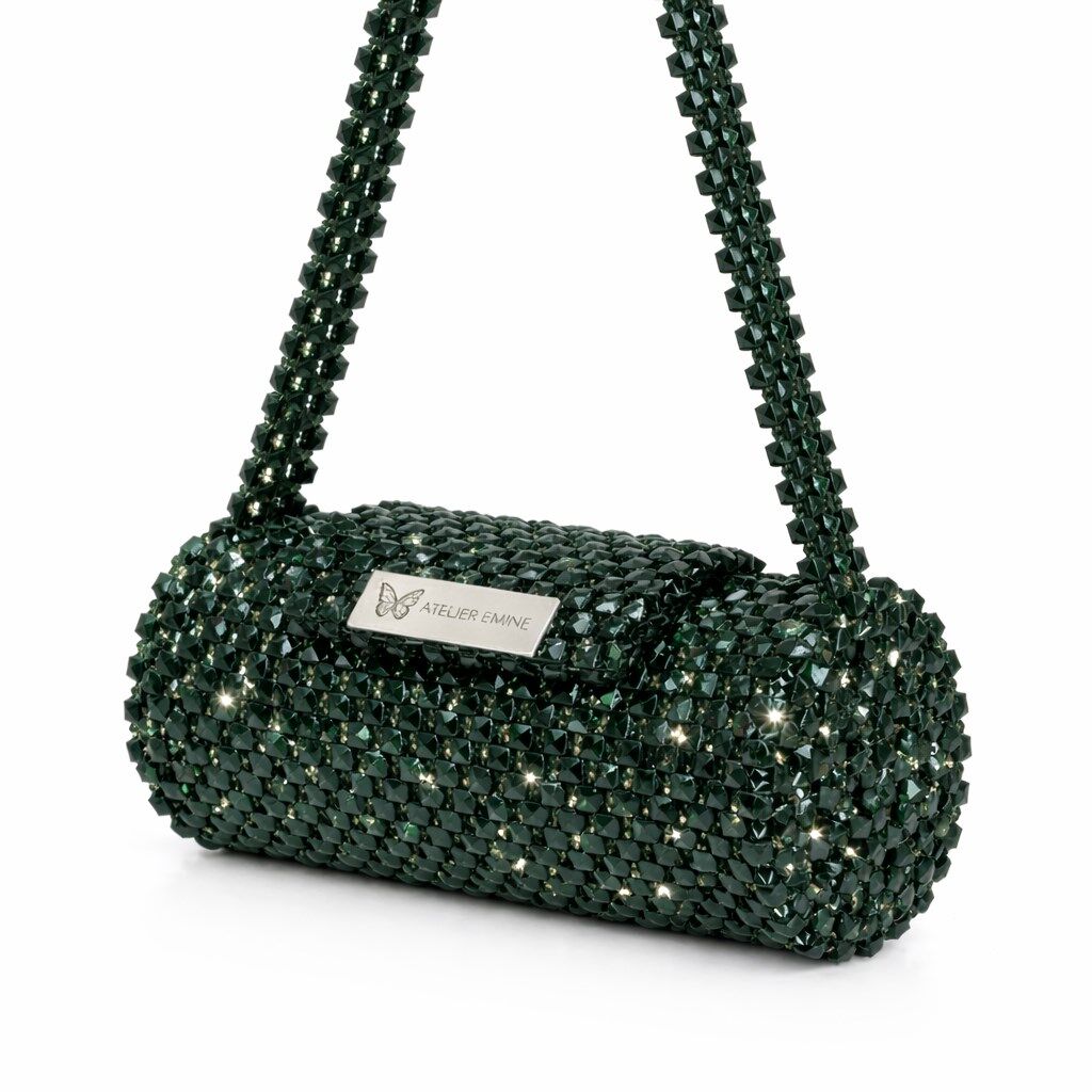 Atelier Emine’in Crystal Gelato Couture serisine ait Ricotta Oliva, 8 mm optik sınıfı kristal boncukların yüksek dayanımlı misina ile örülmesiyle tamamen el işçiliğiyle üretilmiş, zamansız ve rafine bir mini çanta tasarımıdır.