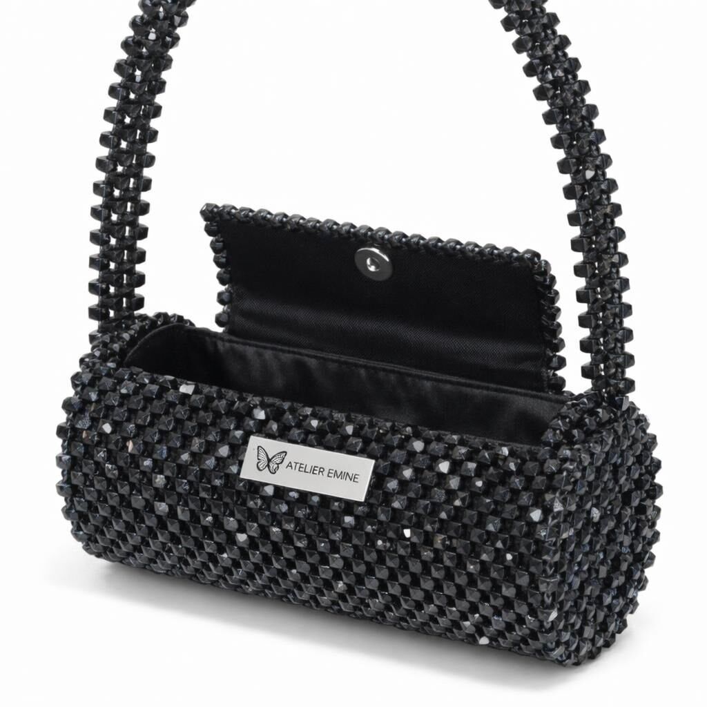 Atelier Emine’in Crystal Gelato Couture serisine ait Ricotta Ossidiana, 8 mm optik sınıfı kristal boncukların yüksek dayanımlı misina ile örülmesiyle tamamen el işçiliğiyle üretilmiş, zamansız ve rafine bir mini çanta tasarımıdır.