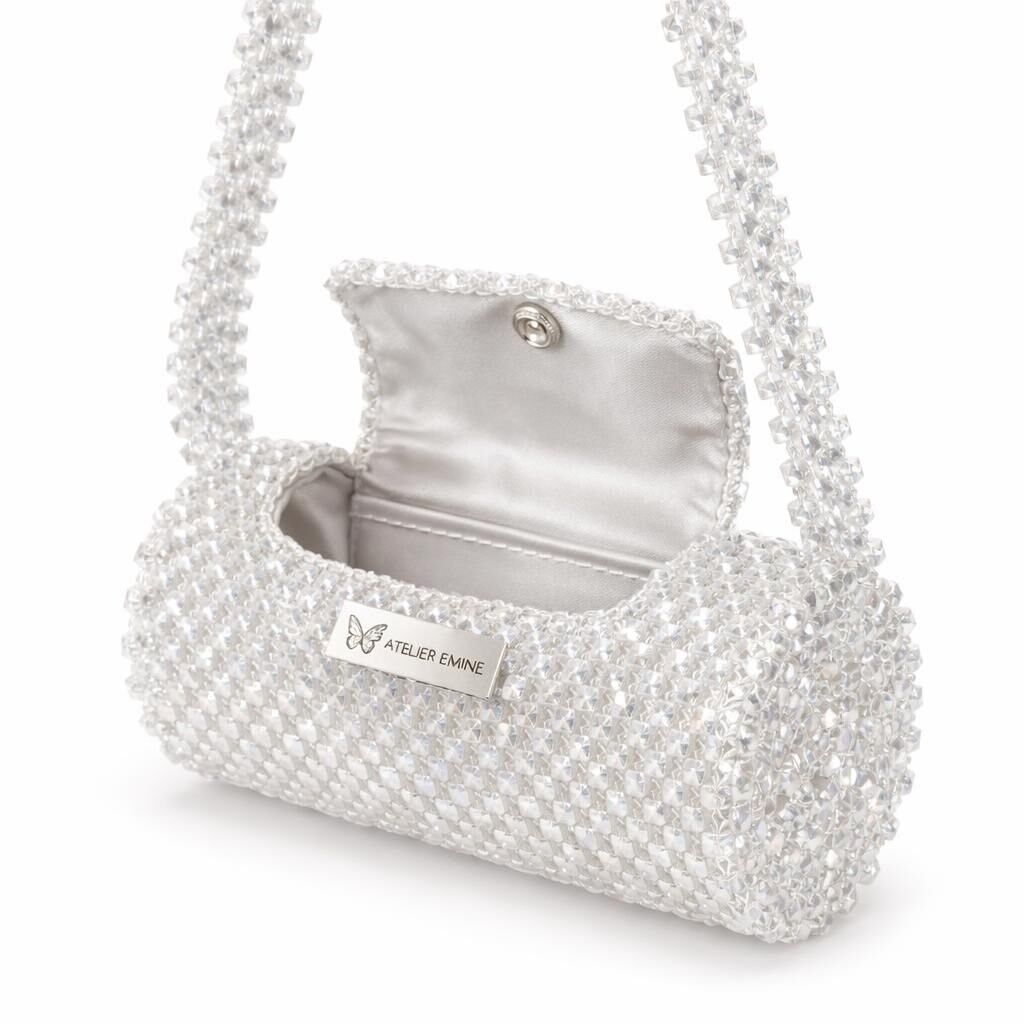 Atelier Emine’in Crystal Gelato Couture serisine ait Ricotta Snow, 8 mm optik sınıfı kristal boncukların yüksek dayanımlı misina ile örülmesiyle tamamen el işçiliğiyle üretilmiş, zamansız ve rafine bir mini çanta tasarımıdır.
