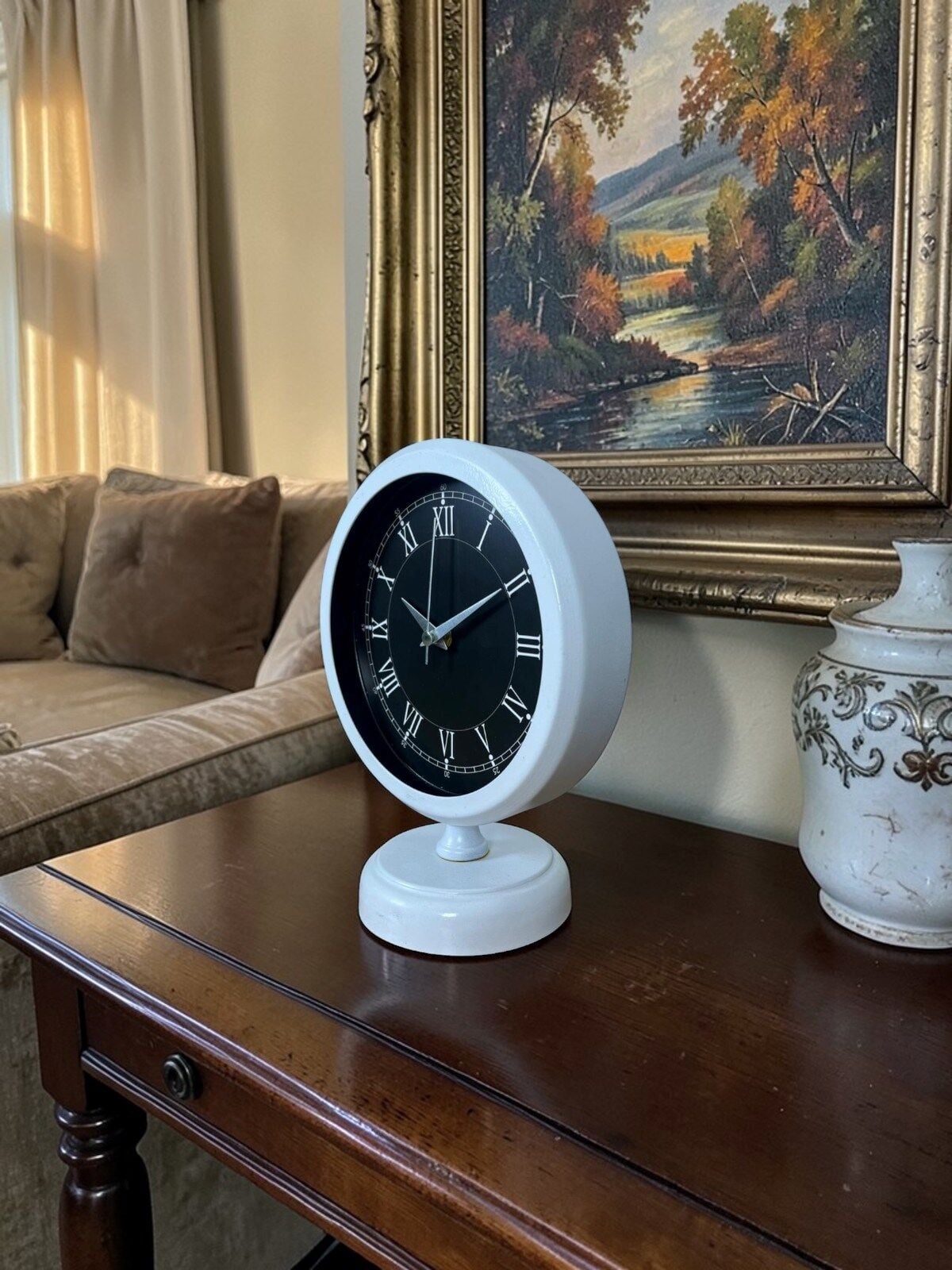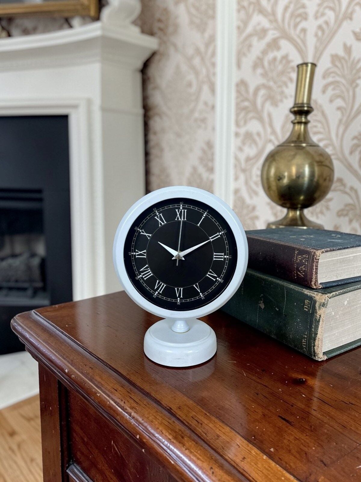 Klasik Roma rakam tasarımıyla zamansız bir şıklık sunan bu beyaz masa saati, siyah kadranı ile güçlü bir kontrast oluşturarak bulunduğu ortama prestijli bir hava katar. Geleneksel tasarım çizgileri modern detaylarla birleşerek hem dekoratif hem de işlevsel bir kullanım sunar. Ofis, salon, çalışma masası ve yatak odası gibi alanlarda şık bir tamamlayıcıdır. Sessiz akan saniye mekanizması sayesinde tik tak sesi oluşturmaz, huzurlu bir kullanım sağlar. Gerçek cam yüzeyi ile hem dayanıklılık hem de net ve kaliteli bir görünüm sunar.