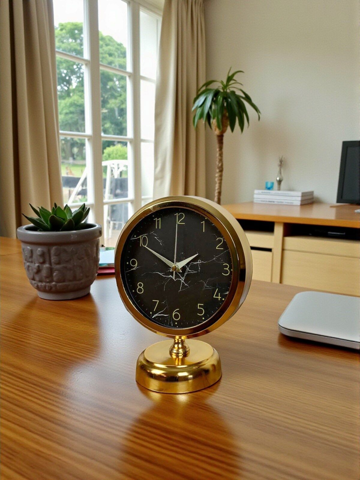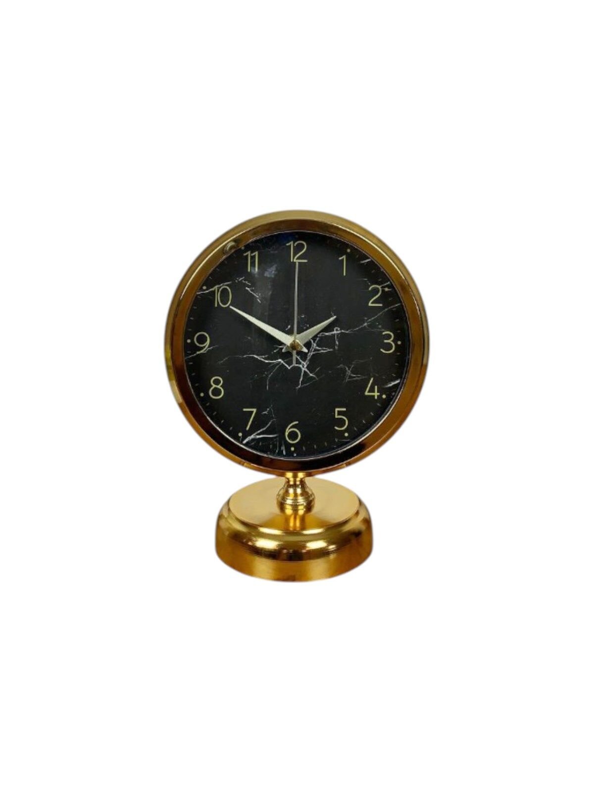 Parlak gold gövdesi ve siyah mermer desenli kadranıyla öne çıkan bu masa saati, dekorasyonda fark yaratmak isteyenler için tasarlanmıştır. Siyah zemin üzerindeki ince mermer efektler saate modern ve sofistike bir karakter kazandırırken, gold rakam ve akrep-yelkovan detayları lüks bir duruş sunar. Klasik yuvarlak formu sayesinde hem modern hem de klasik dekorasyon tarzlarına kolayca uyum sağlar.