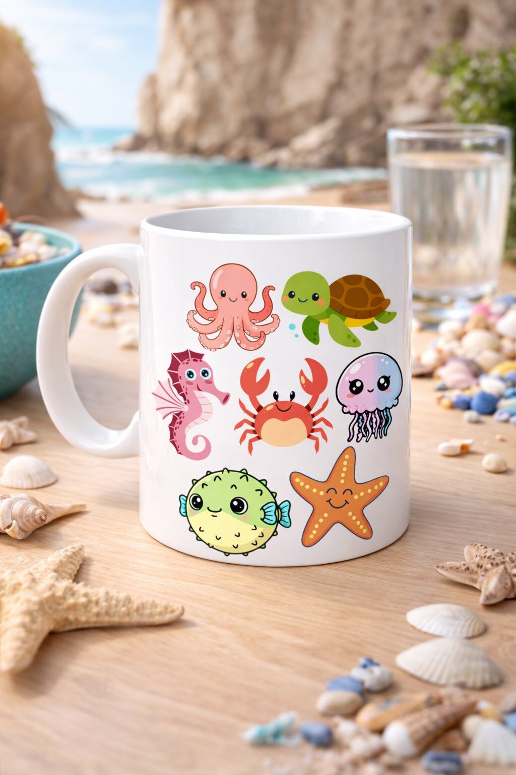 Bu özel tasarım porselen kupa üzerinde; ahtapot, deniz kaplumbağası, yengeç, denizatı, denizanası ve deniz yıldızı gibi birbirinden sevimli deniz canlıları yer alıyor.