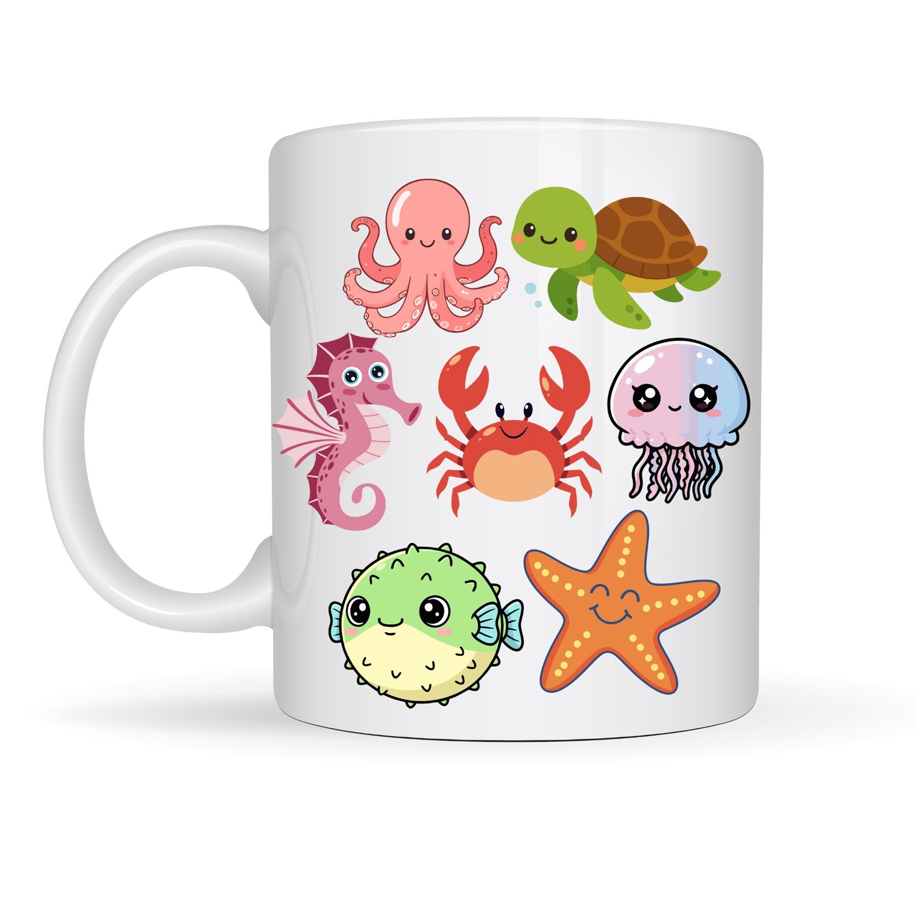 Sevimli Deniz Canlıları Desenli Porselen Kupa MODEL 118 – Ahtapot, Kaplumbağa, Yengeç ve Deniz Yıldızlı Kahve Kupası