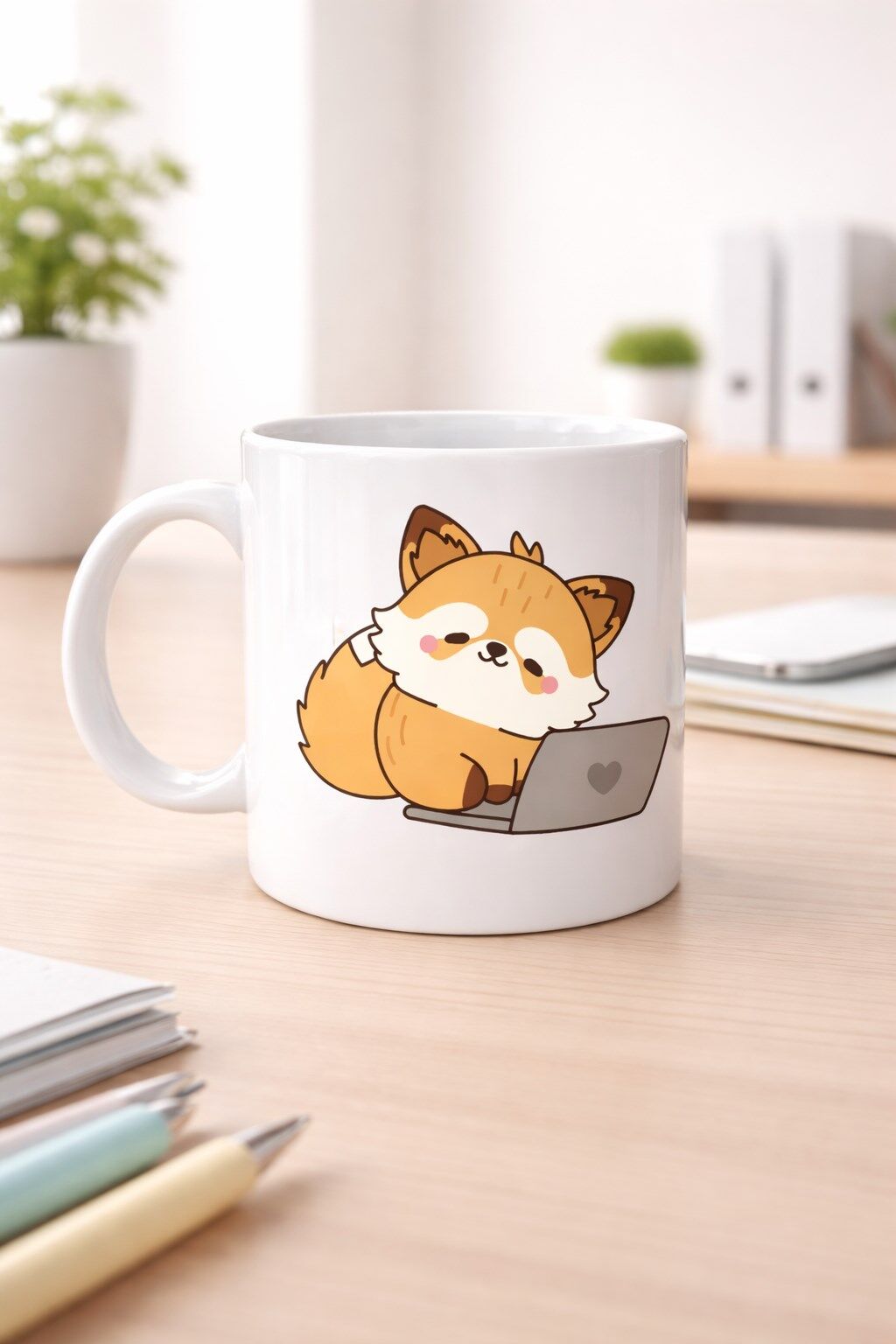 Sevimli Tilki Tasarımlı Porselen Kupa MODEL 115 – Laptoplu Tatlı Tilki Figürlü Ofis & Ev Kullanımı İçin Kahve Kupası
