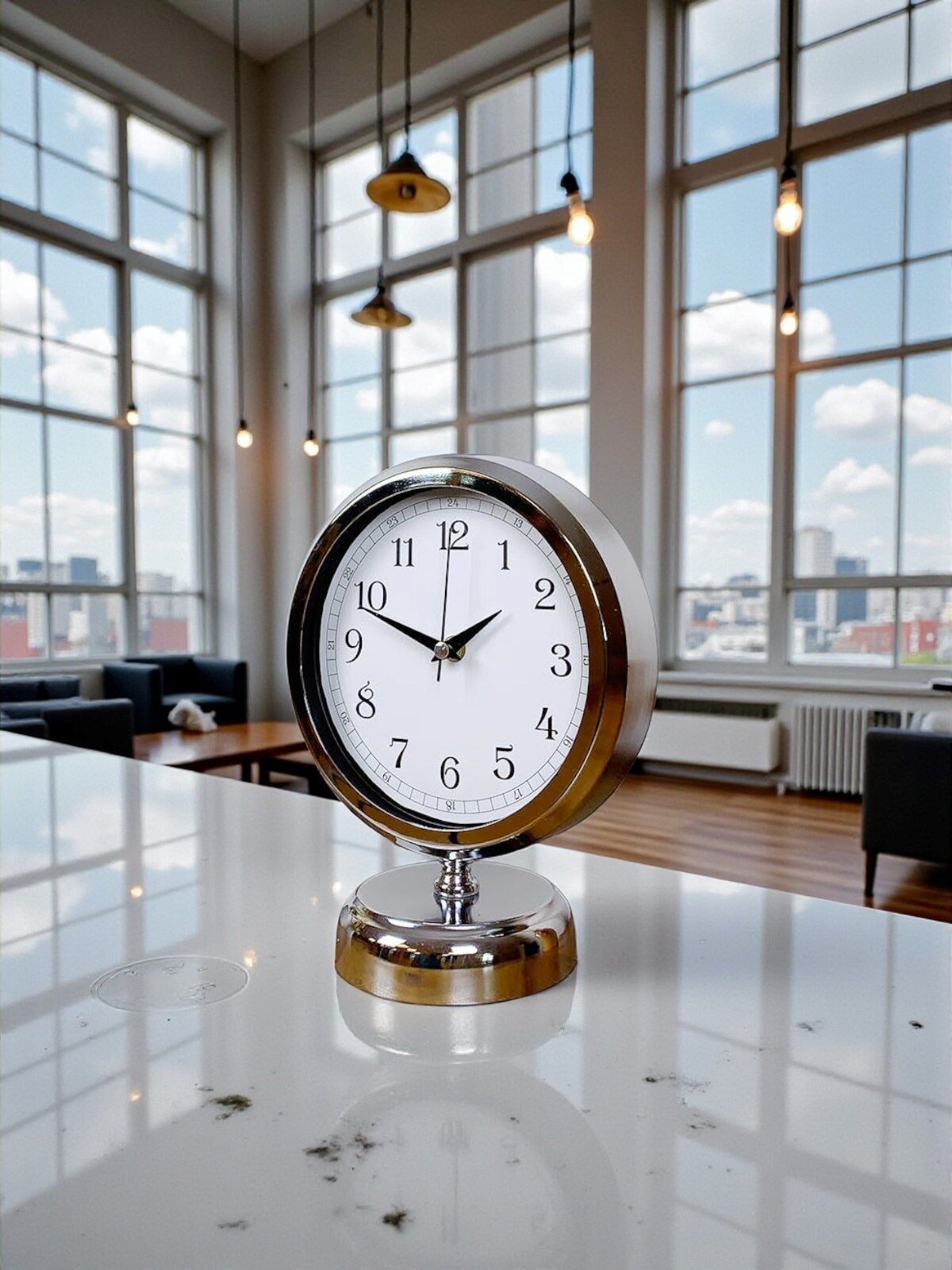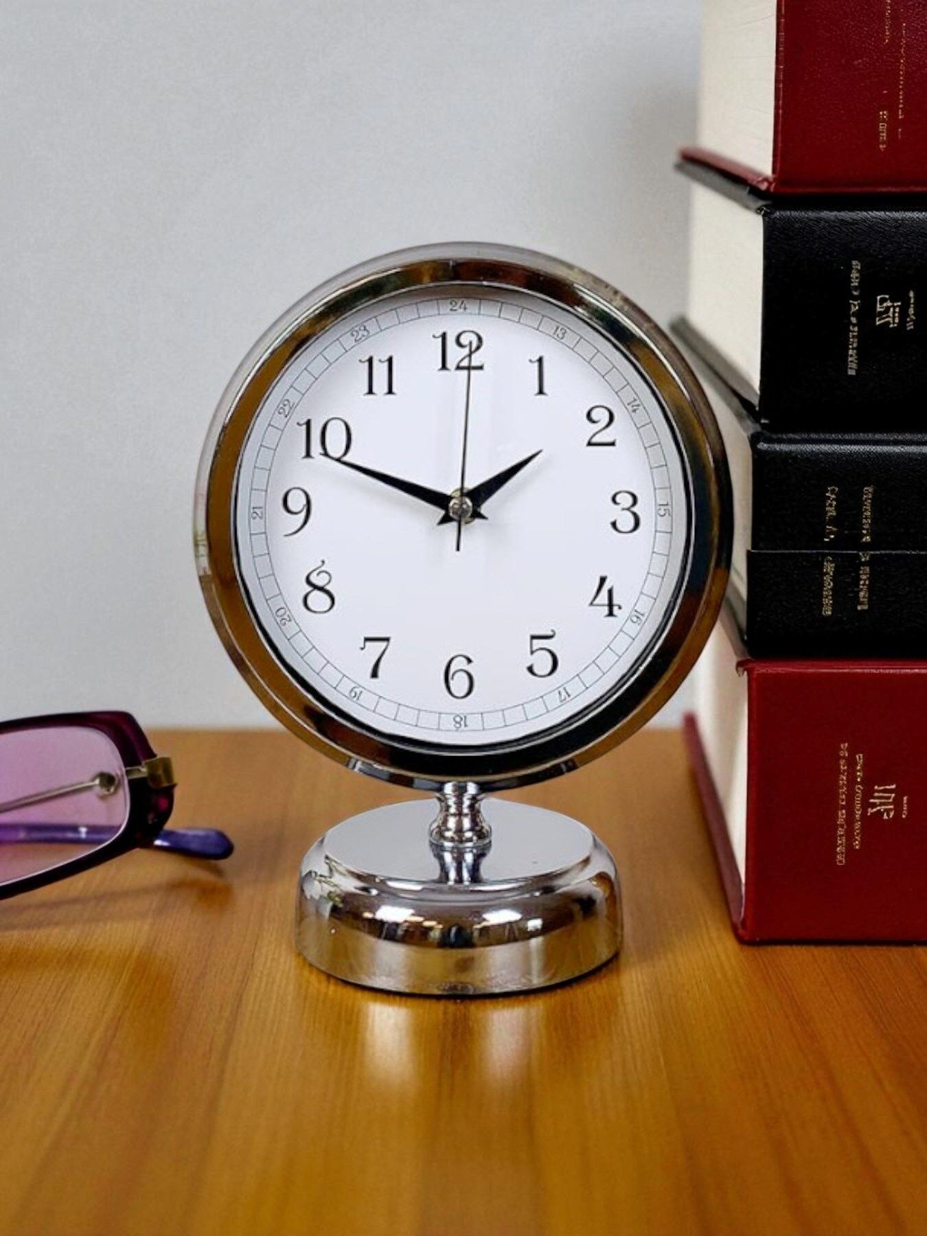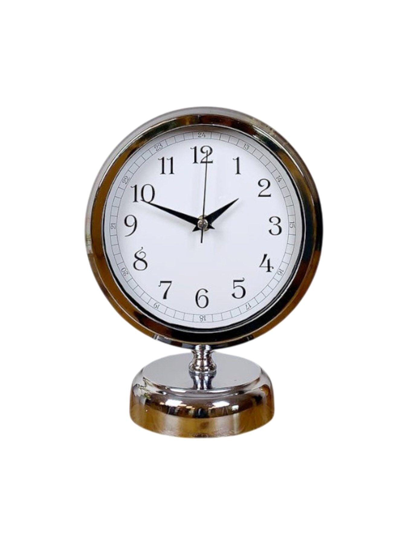 Parlak krom kaplaması ve gerçek cam ön yüzeyi ile hem dayanıklı hem de şık bir görünüm sunan bu dekoratif masa saati, sessiz çalışan mekanizması sayesinde tik-tak sesi olmadan kullanım rahatlığı sağlar. Modern ve zarif tasarımıyla ofis, salon, çalışma masası veya vitrinde mükemmel bir tamamlayıcıdır.