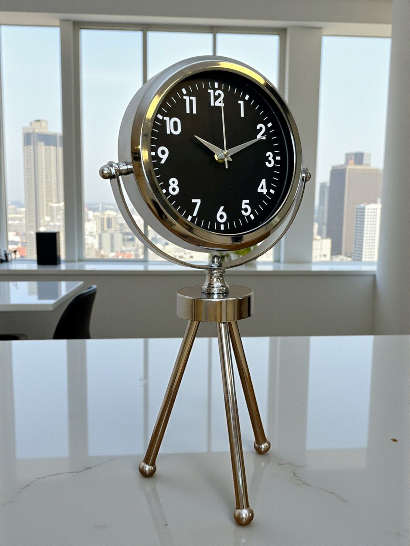 45 x 25 cm ölçülerindeki bu şık krom üç ayaklı masa saati, modern tasarımı ve parlak metal gövdesiyle her ortamda dikkat çeken zarif bir dekorasyon ürünüdür. Gerçek cam korumalı kadranı sayesinde uzun ömürlü ve net bir görüntü sunar. Sessiz çalışan mekanizması ile ev, ofis ve çalışma alanlarında konforlu bir kullanım sağlar. Dayanıklı metal tripod ayak yapısı, saati sadece bir zaman göstergesi değil aynı zamanda estetik bir obje haline getirir.