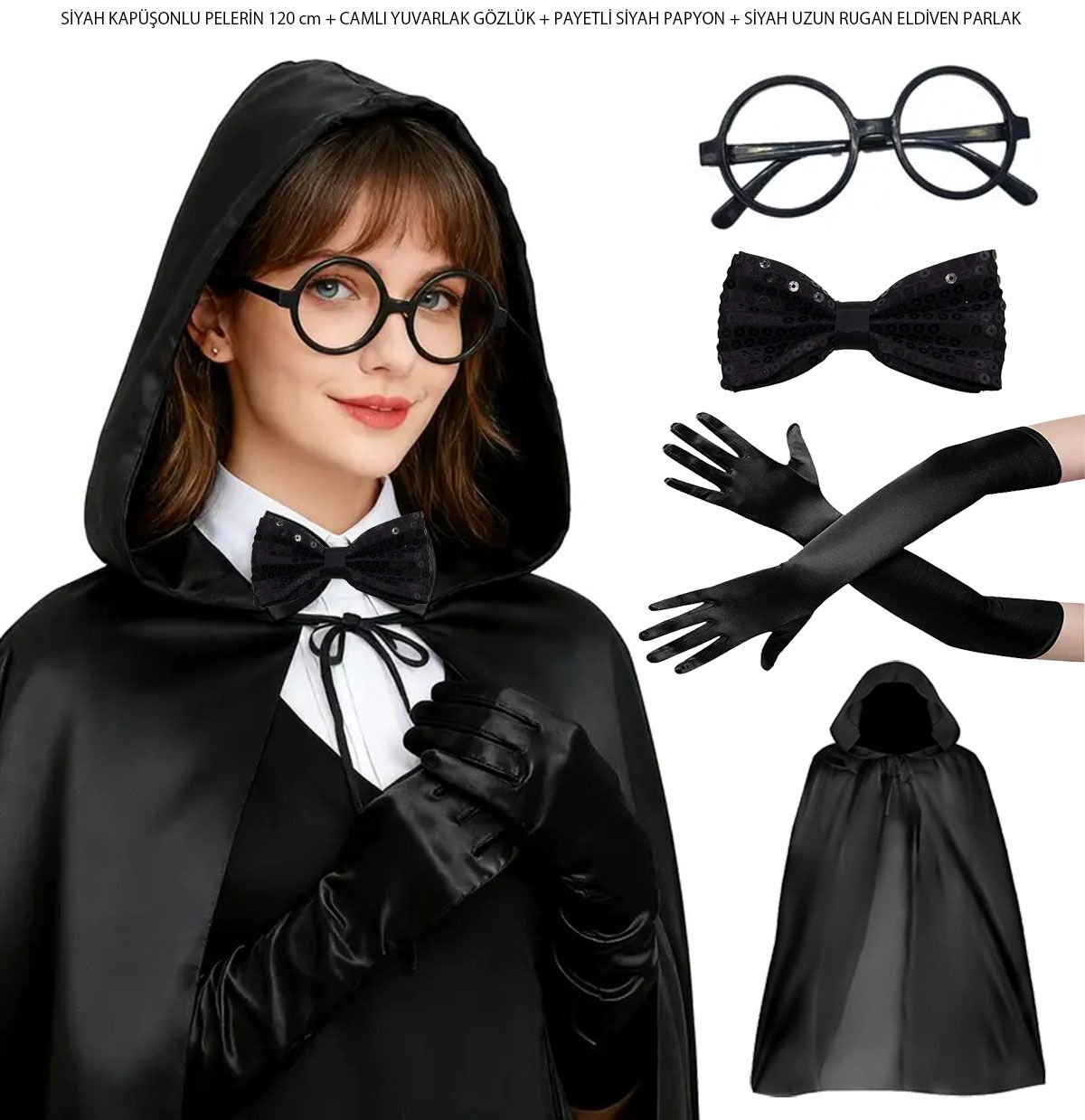 SİYAH KAPÜŞONLU BÜYÜCÜ VE CADI PELERİN KOSTÜM SETİ (4 PARÇA)