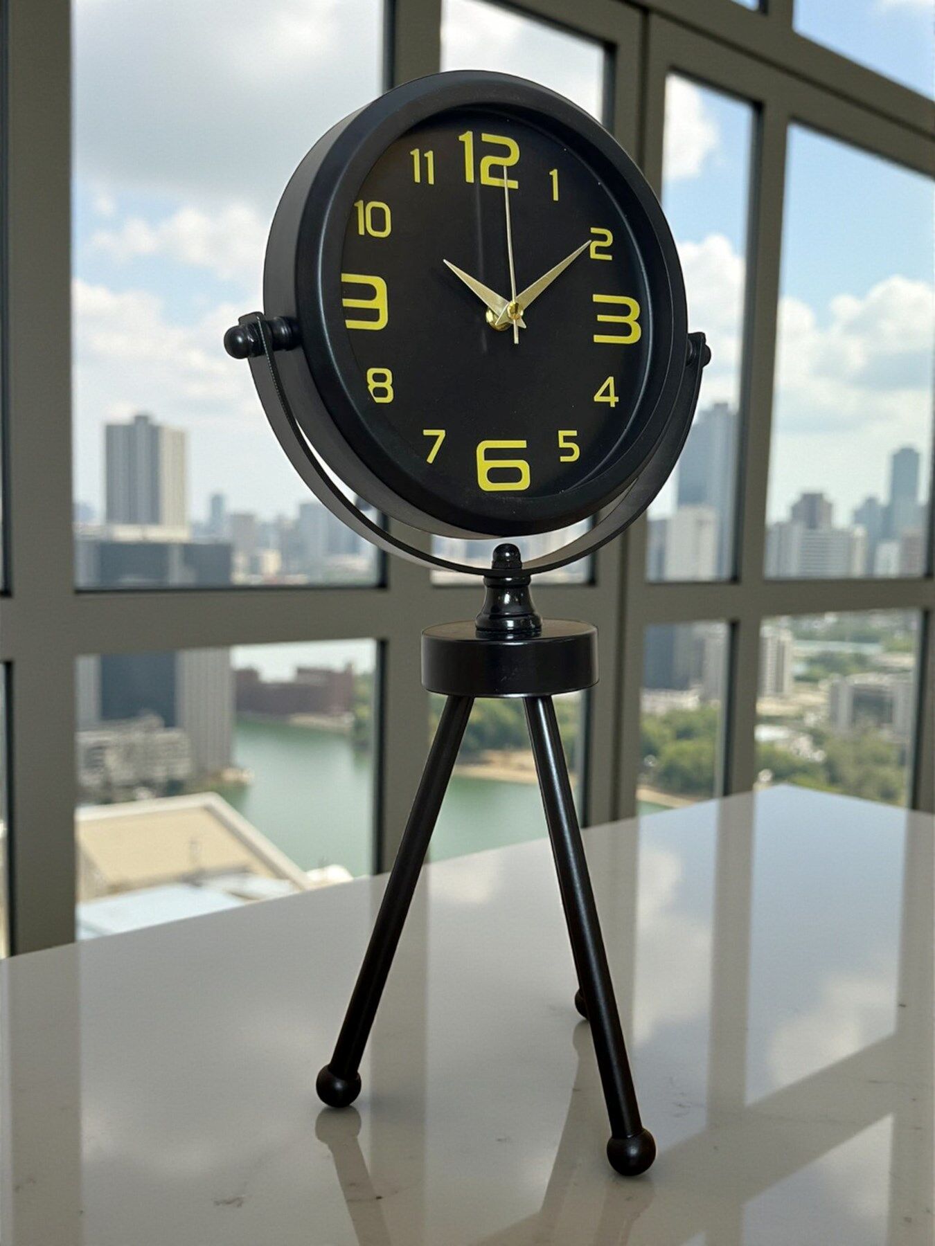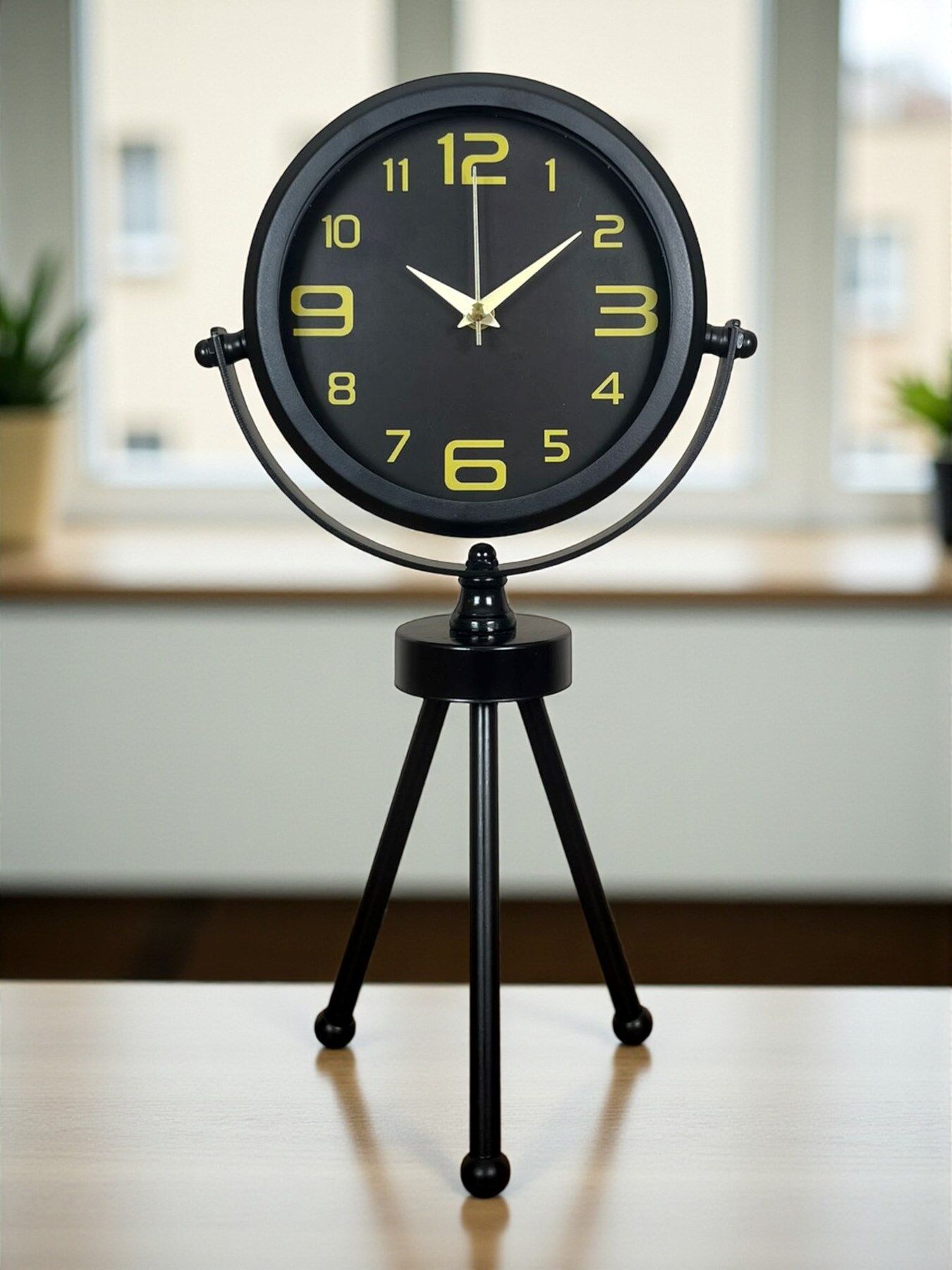 45 x 25 cm ölçülerindeki bu modern siyah üç ayaklı masa saati, minimal tasarımı ve güçlü duruşuyla her ortama şıklık katar. Gerçek cam korumalı kadranı sayesinde net görüntü ve uzun ömürlü kullanım sağlar. Tamamen metal gövdesi ve tripod ayak yapısıyla sağlam, dekoratif ve premium bir görünüm sunar. Sessiz akar saniye mekanizmasıyla ev, ofis ve çalışma alanlarında rahatsızlık vermeden kullanılabilir.