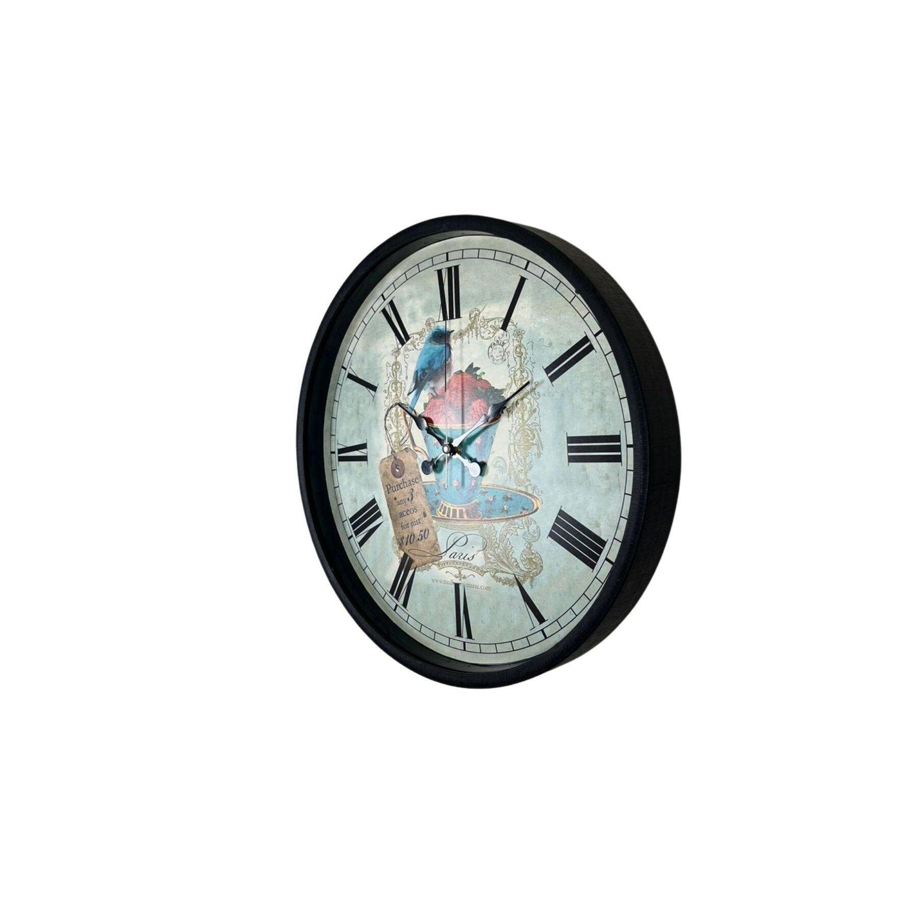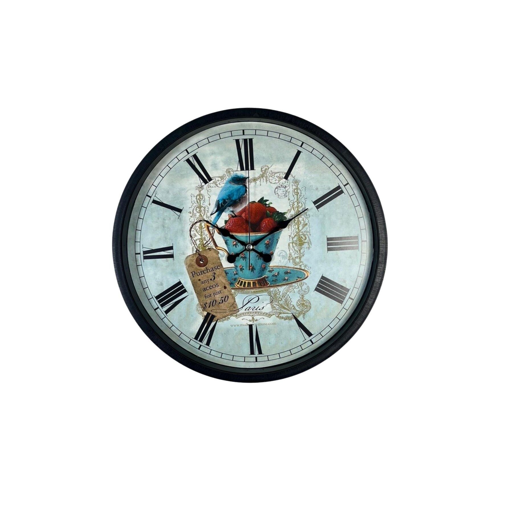 Zarif ve nostaljik tasarımıyla dikkat çeken 36 cm siyah duvar saati, kuş ve çilek temalı vintage kadran tasarımıyla yaşam alanlarınıza estetik ve şık bir atmosfer kazandırır. Paris tarzı dekoratif detaylara sahip özel tasarımı sayesinde salon, mutfak, oturma odası ve kafe dekorasyonlarında dikkat çekici bir aksesuar olarak kullanılabilir.