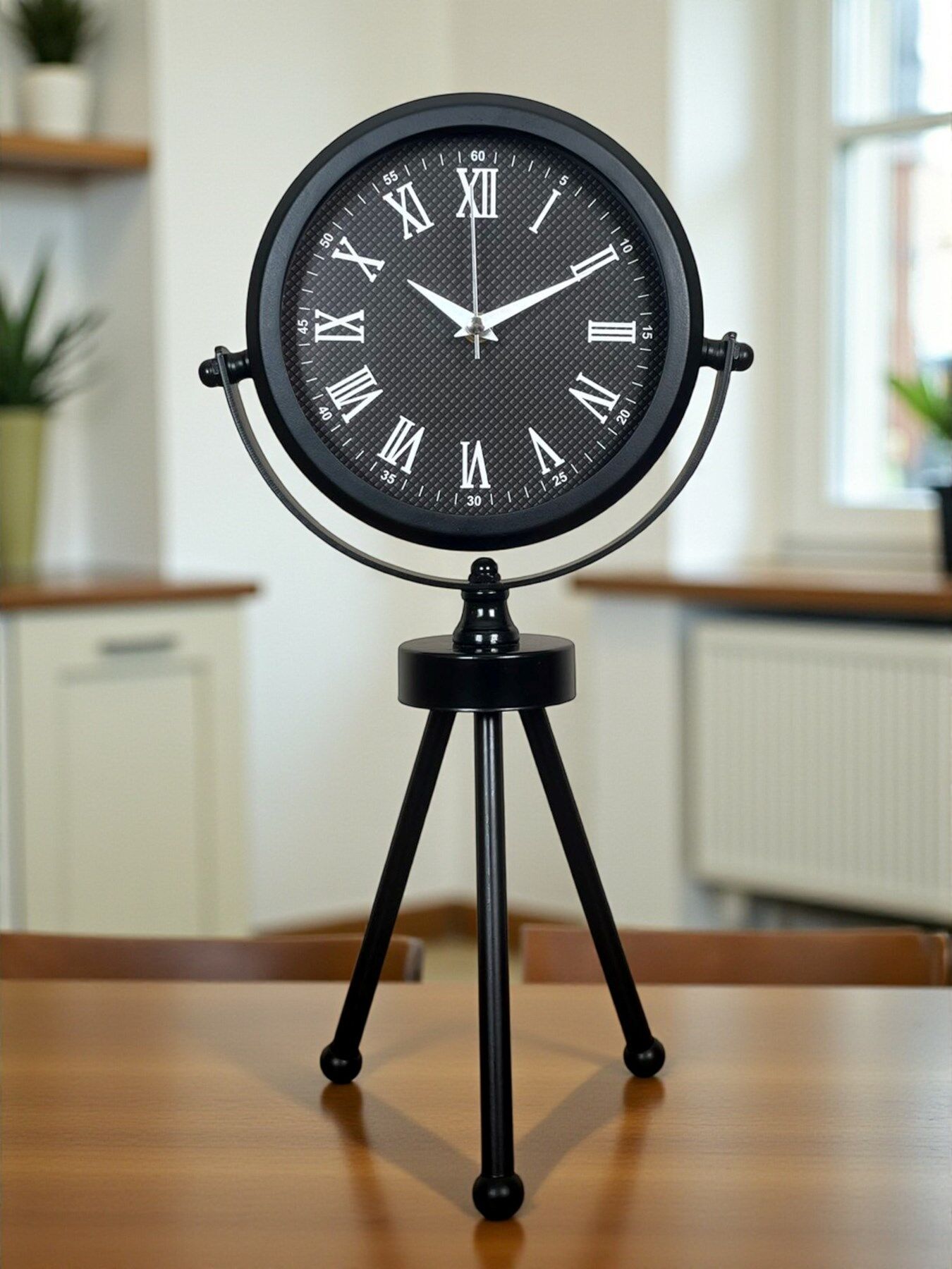 45 x 25 cm ölçülerindeki bu modern siyah üç ayaklı masa saati, minimal tasarımı ve güçlü duruşuyla her ortama şıklık katar. Gerçek cam korumalı kadranı sayesinde net görüntü ve uzun ömürlü kullanım sağlar. Tamamen metal gövdesi ve tripod ayak yapısıyla sağlam, dekoratif ve premium bir görünüm sunar. Sessiz akar saniye mekanizmasıyla ev, ofis ve çalışma alanlarında rahatsızlık vermeden kullanılabilir.
