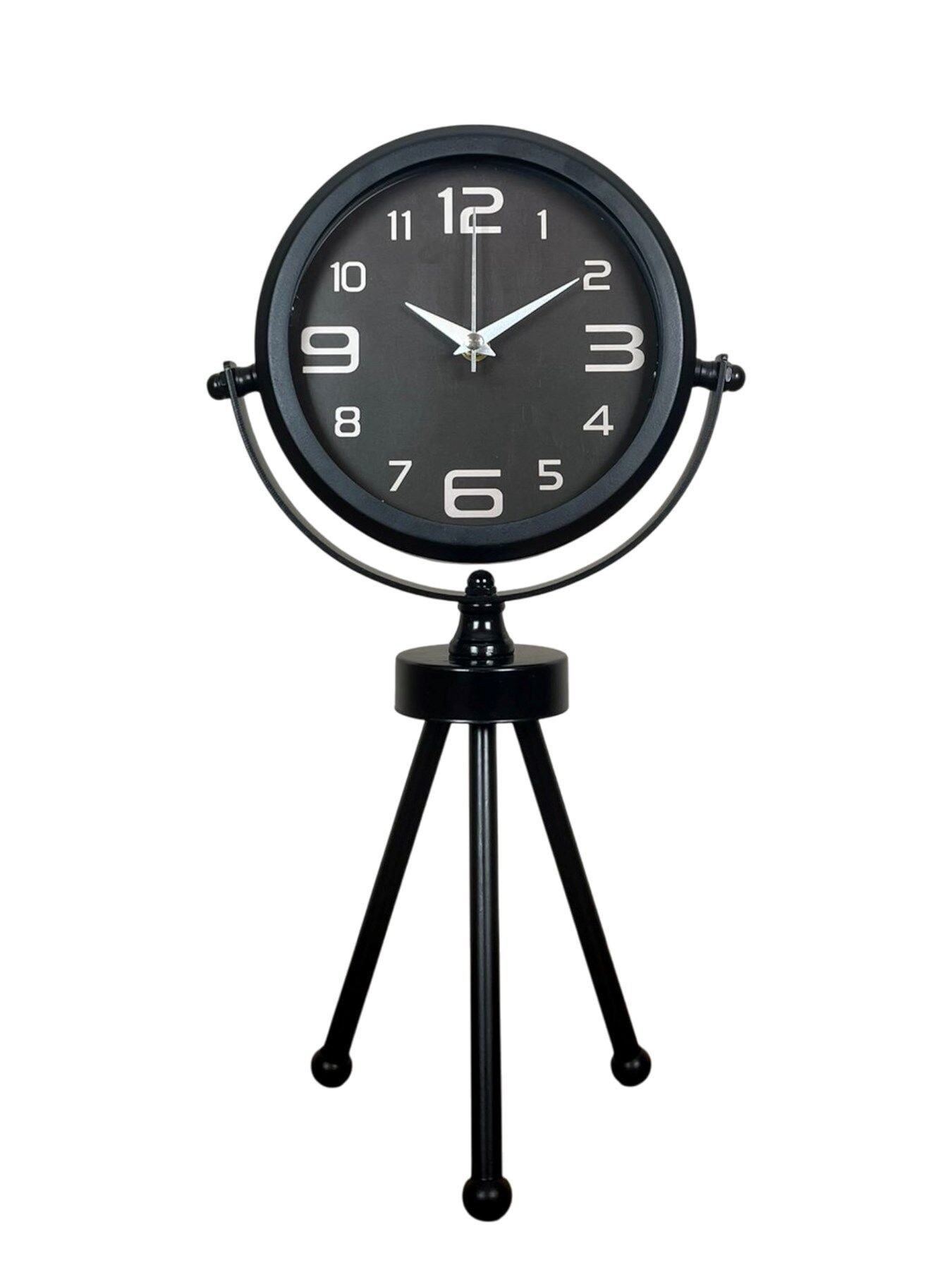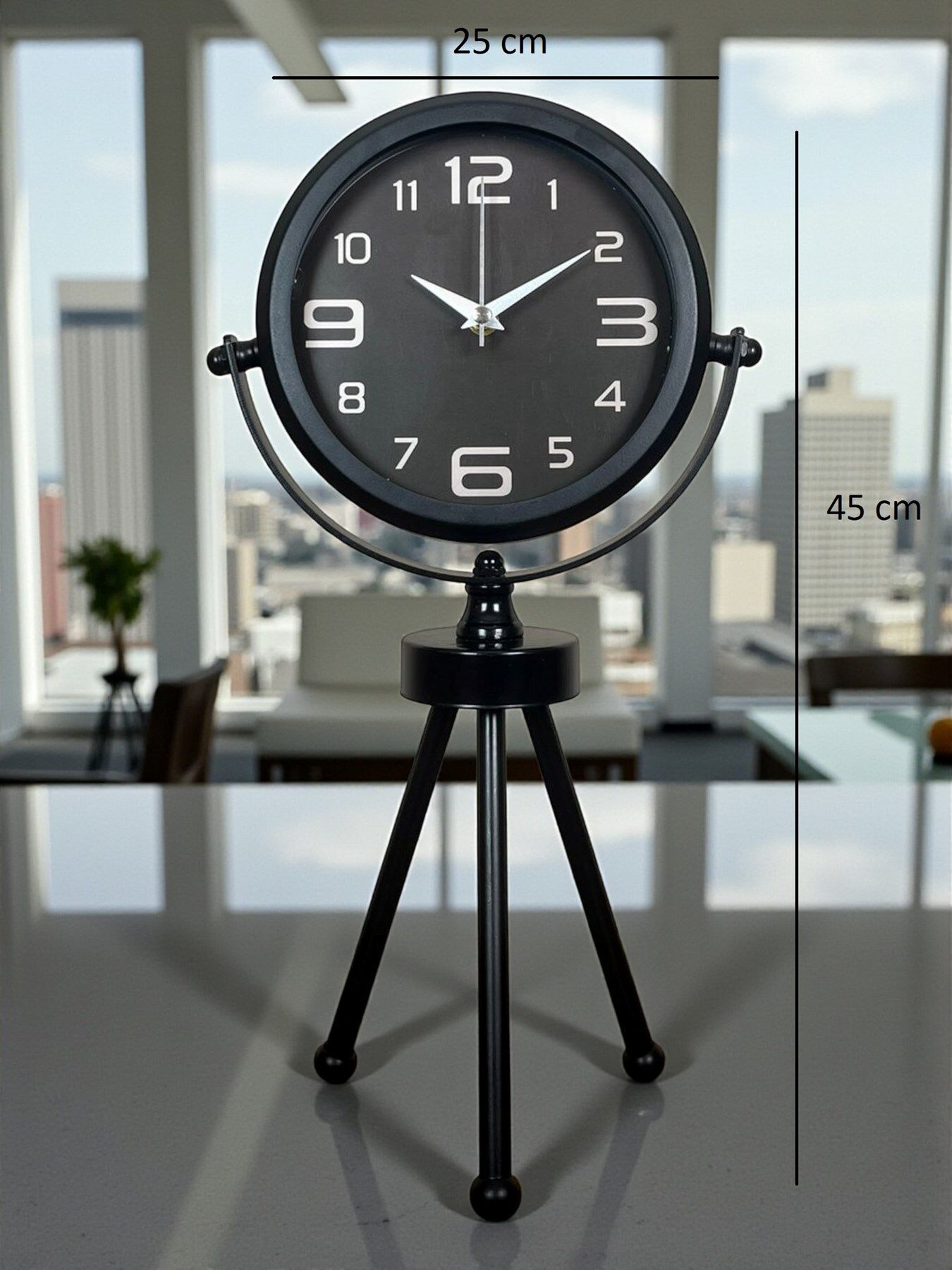 45 x 25 cm ölçülerindeki bu modern siyah üç ayaklı masa saati, minimal tasarımı ve güçlü duruşuyla her ortama şıklık katar. Gerçek cam korumalı kadranı sayesinde net görüntü ve uzun ömürlü kullanım sağlar. Tamamen metal gövdesi ve tripod ayak yapısıyla sağlam, dekoratif ve premium bir görünüm sunar. Sessiz akar saniye mekanizmasıyla ev, ofis ve çalışma alanlarında rahatsızlık vermeden kullanılabilir.