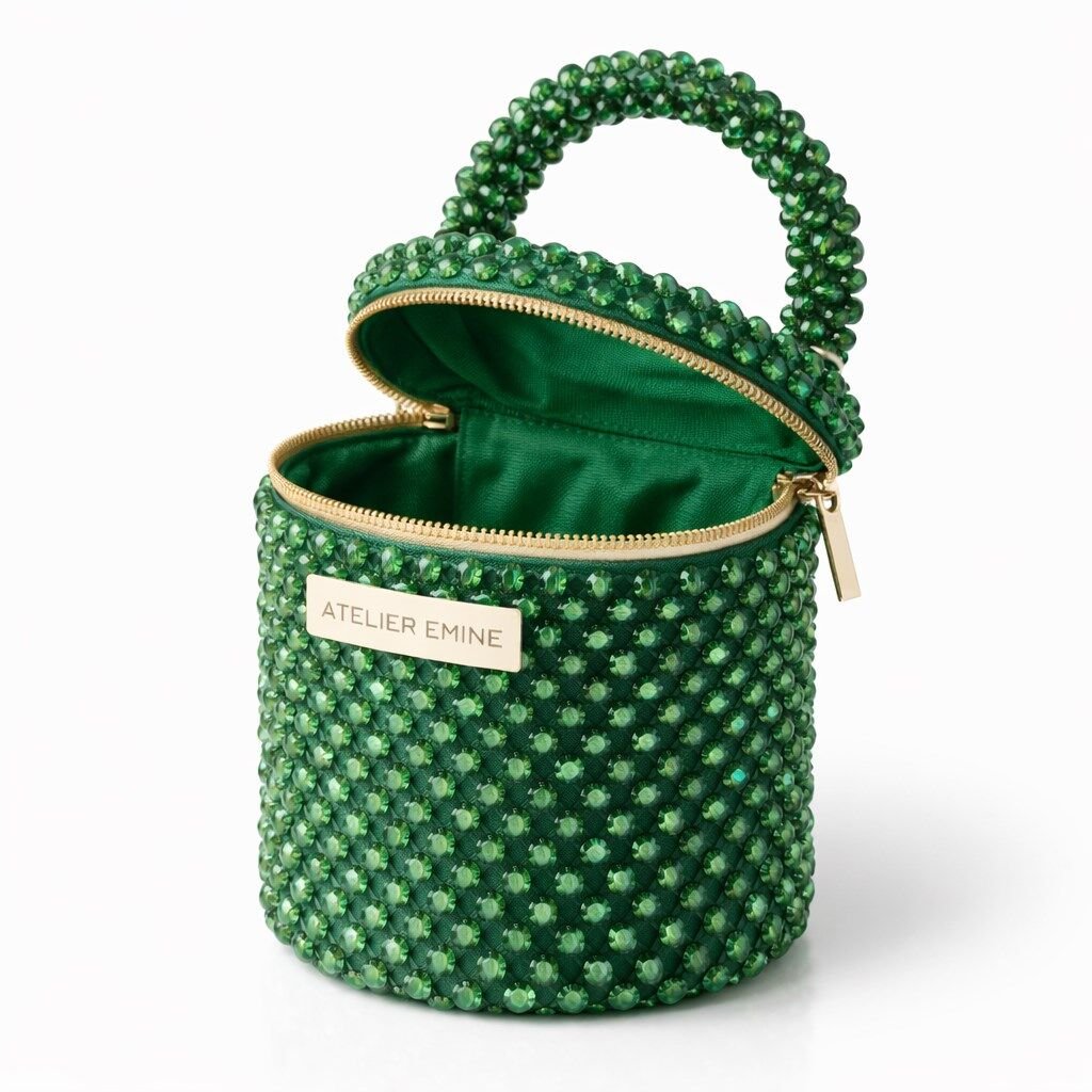 Kristal boncuklar, yüzeyde maksimum ışık kırılımı sağlayacak şekilde yoğun ve düzenli bir örgü yapısıyla tek tek işlenmiş; gövde, silindirik ve dikey hatlarda yapılandırılarak yüksek form stabilitesi elde edilmiştir. Kristal örgü, çantanın tüm yüzeyinde homojen bir doku sürekliliği sunar.
