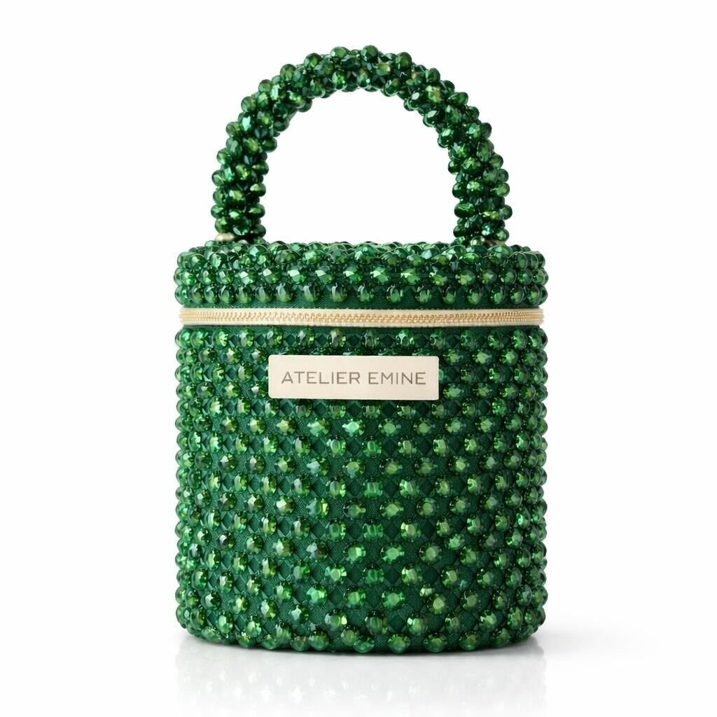 Atelier Emine’in Crystal Gelato Couture serisine ait Sorbetto Mint, 8 mm optik sınıfı kristal boncukların yüksek dayanımlı misina ile örülmesiyle tamamen el işçiliğiyle üretilmiş, mimari netlikte formu olan premium mini çanta modelidir.