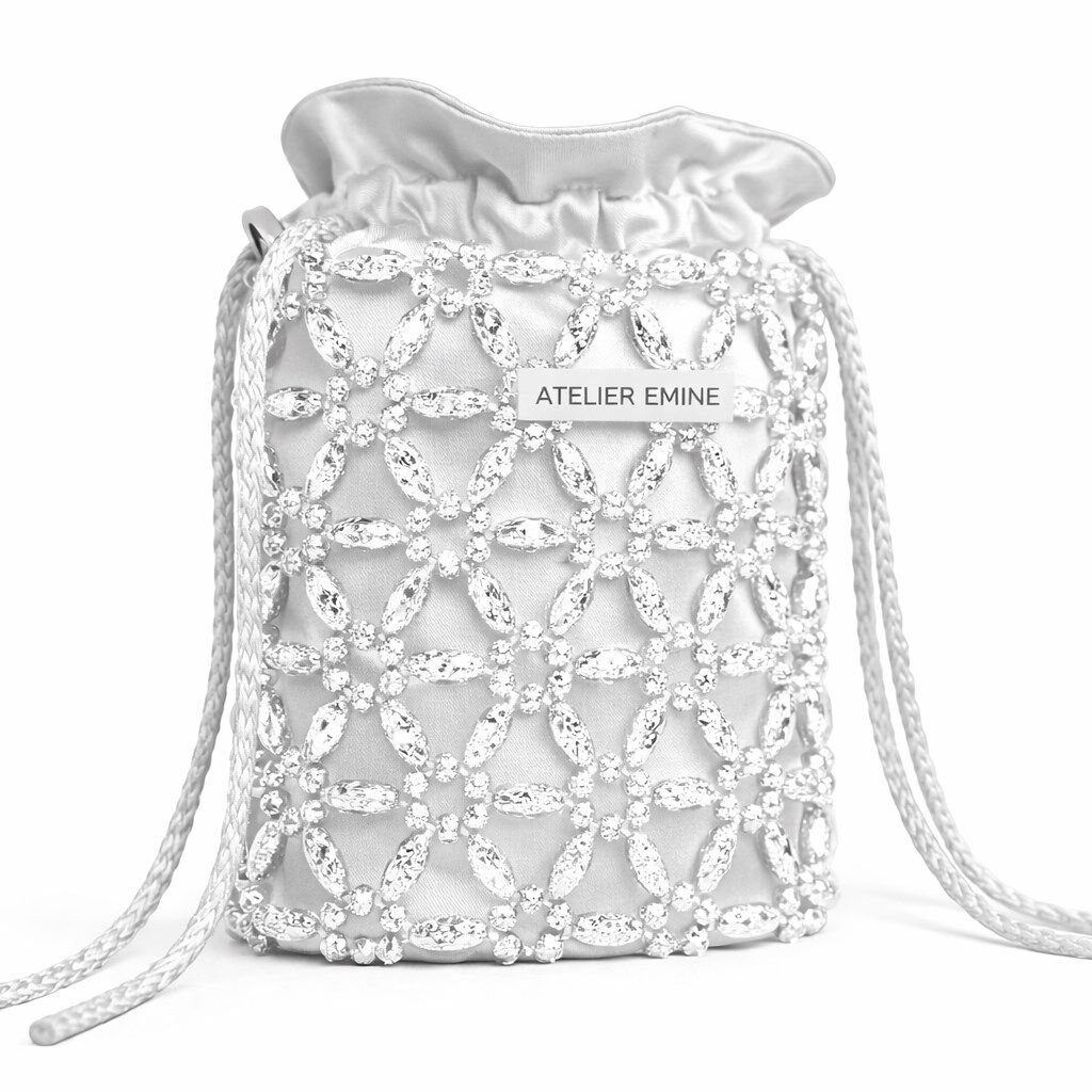 Atelier Emine’in Crystal Gelato Couture serisine ait Sorbetto Rice, 8 mm optik sınıfı kristal boncukların yüksek dayanımlı misina ile file örgü tekniğinde birleştirilmesiyle tamamen el işçiliğiyle üretilmiş, yumuşak hacimli ancak kontrollü form yapısına sahip premium mini pouch çanta modelidir.