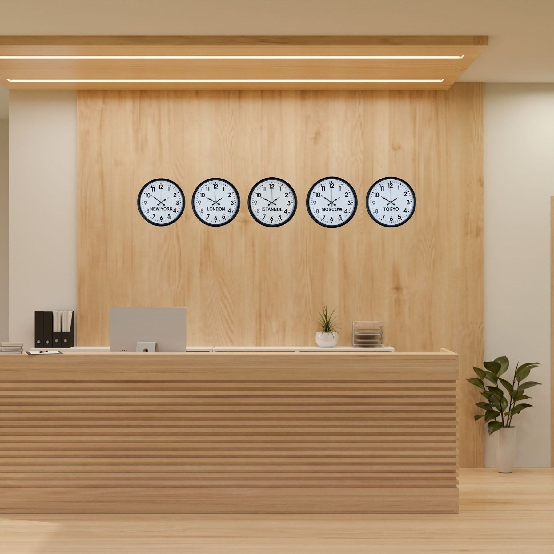 5 farklı zaman dilimini tek duvarda sunarak global zaman yönetimini kolaylaştırır. Özellikle uluslararası iş yapan firmalar için büyük avantaj sağlarken, sade ve güçlü tasarımıyla bulunduğu ortamda dikkat çekici bir odak noktası oluşturur.