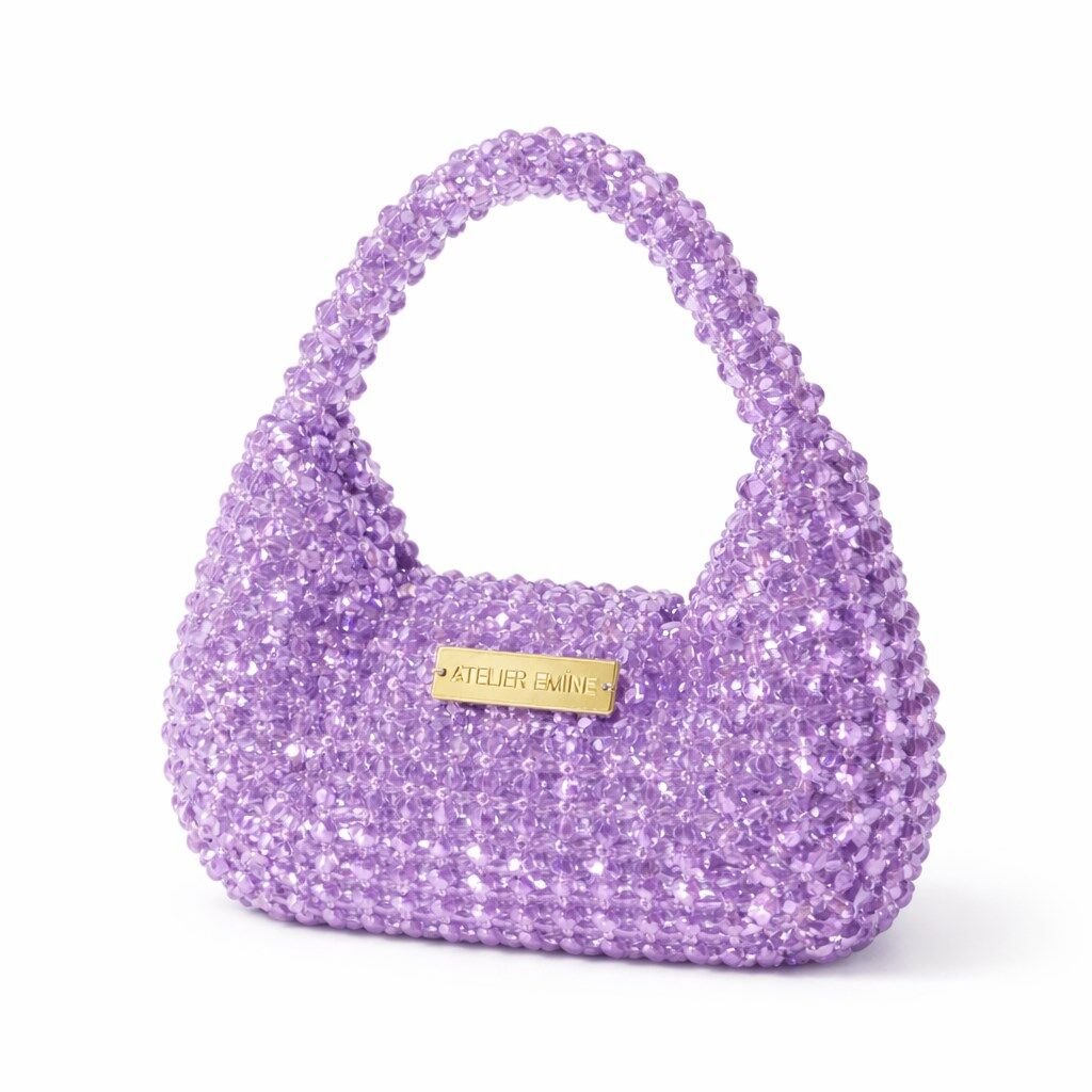 Atelier Emine’in Crystal Gelato Couture koleksiyonuna ait Stracci Lavanda, 8 mm optik sınıfı kristal boncukların yüksek dayanımlı misina ile tek tek örülmesiyle tamamen el işçiliğiyle üretilmiş, yumuşak geçişli ve dengeli hacme sahip premium mini çanta modelidir.