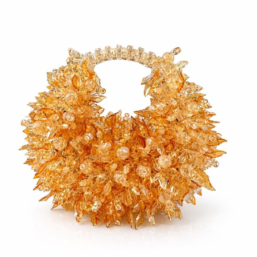 Bu modelin gövdesi, düzenli dizilimlerden bilinçli biçimde kaçınılarak; iğnemsi, yaprak benzeri ve parçalı kristal formların farklı açılarla üst üste bindirilmesiyle oluşturulmuştur. Kristaller, yüzeyde tek bir düzlem oluşturmak yerine, dışa doğru patlayan ve içe doğru çöken mikro hacimler üretir. Bu yapı, çantaya mercan benzeri, organik ve neredeyse canlı bir doku kazandırır.