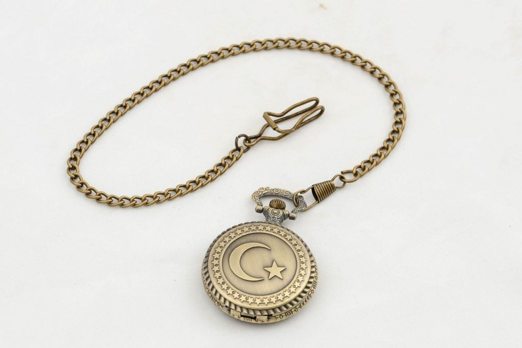 TÜRK BAYRAKLI KÖSTEKLİ SAATÜrün ÖzellikleriTürk bayraklı köstekli saat, nostaljik tasarımı ve detaylı işçiliği ile klasik saat severler için şık bir aksesuardır. Metal gövdeye sahip olup, kapağında ay ve yıldız motifi yer almaktadır. Zincirli yapısı sayesinde cepte taşınabilir ve özel günlerde kullanıma uygundur. Antik bronz renkli kaplama, saate vintage bir hava katar. Hem koleksiyonluk bir obje hem de anlamlı bir hediye alternatifi olarak tercih edilebilir.Paket İçeriği1 adet Türk Bayraklı Köstekli Saat