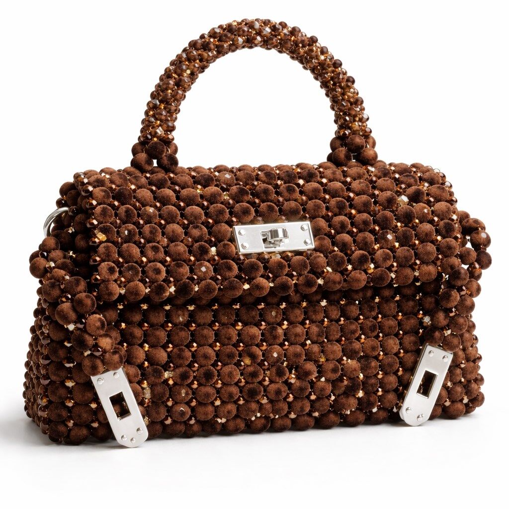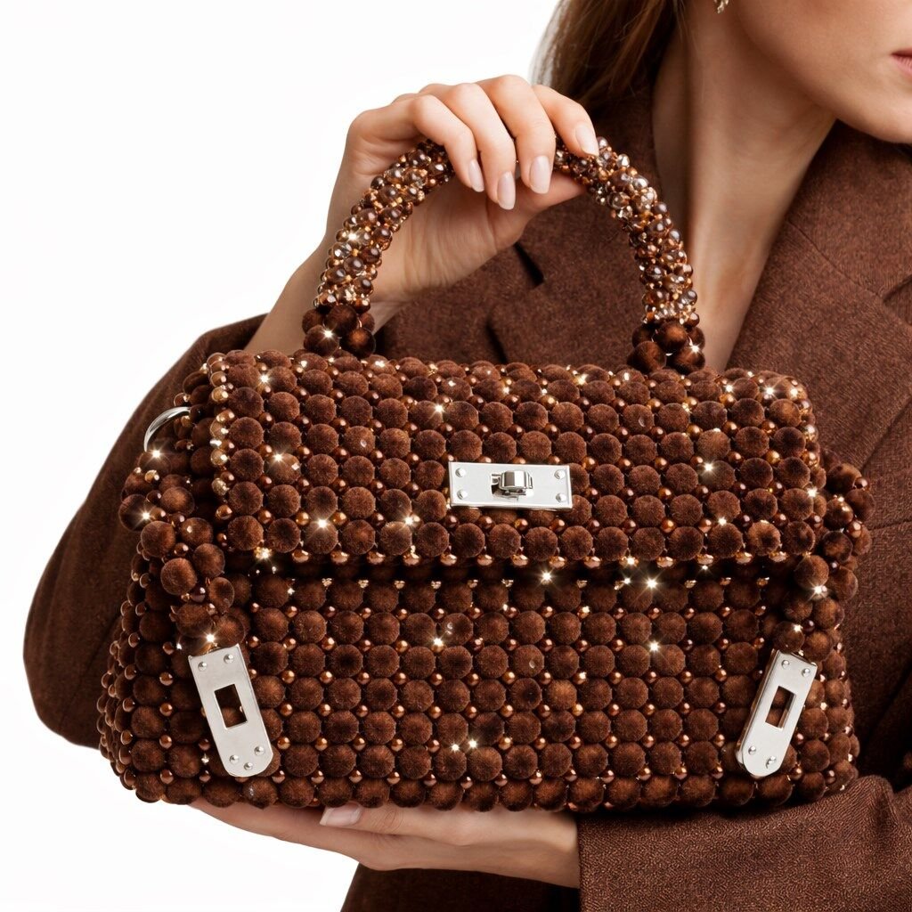 Atelier Emine’in Velvet Noir Couture serisine ait Vélis Mahogany, kadife yüzeyli mikro boncukların misina ile örülerek oluşturduğu yoğun dokulu strüktürün, aralıklı yerleştirilmiş çok yüzeyli kristal boncuklarla kesilmesiyle tasarlanmış, yüksek işçilikli couture bir çanta modelidir.