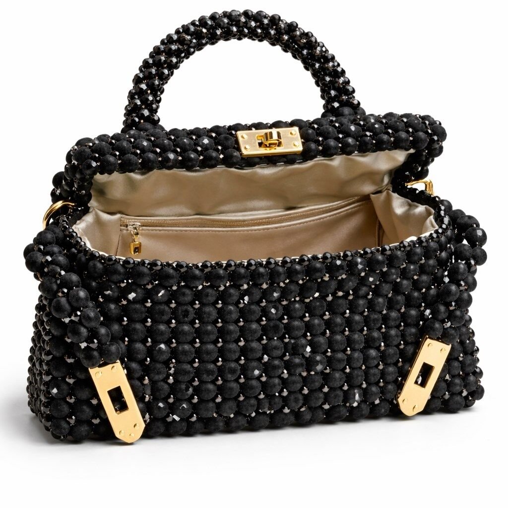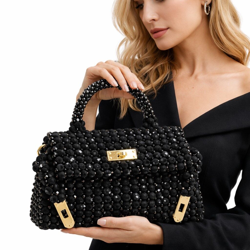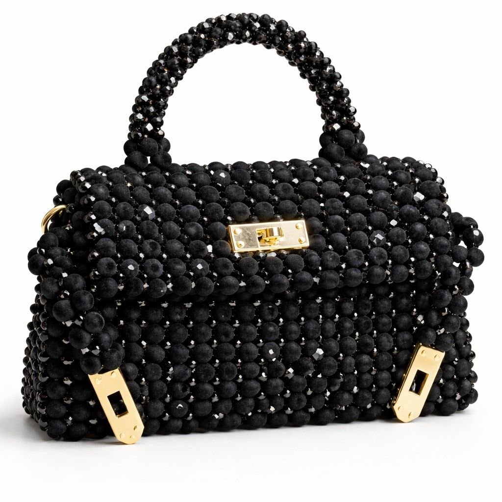 Gövde formu, kadife boncuk örgünün doğal akışını koruyacak şekilde dengelenmiş; aynı zamanda kristal boncukların ağırlığını taşıyabilmesi için içten yapısal destekle güçlendirilmiştir. Misina örgü tekniği sayesinde çanta yüzeyi dikişsiz, kesintisiz ve heykelsi bir bütünlük sunar.