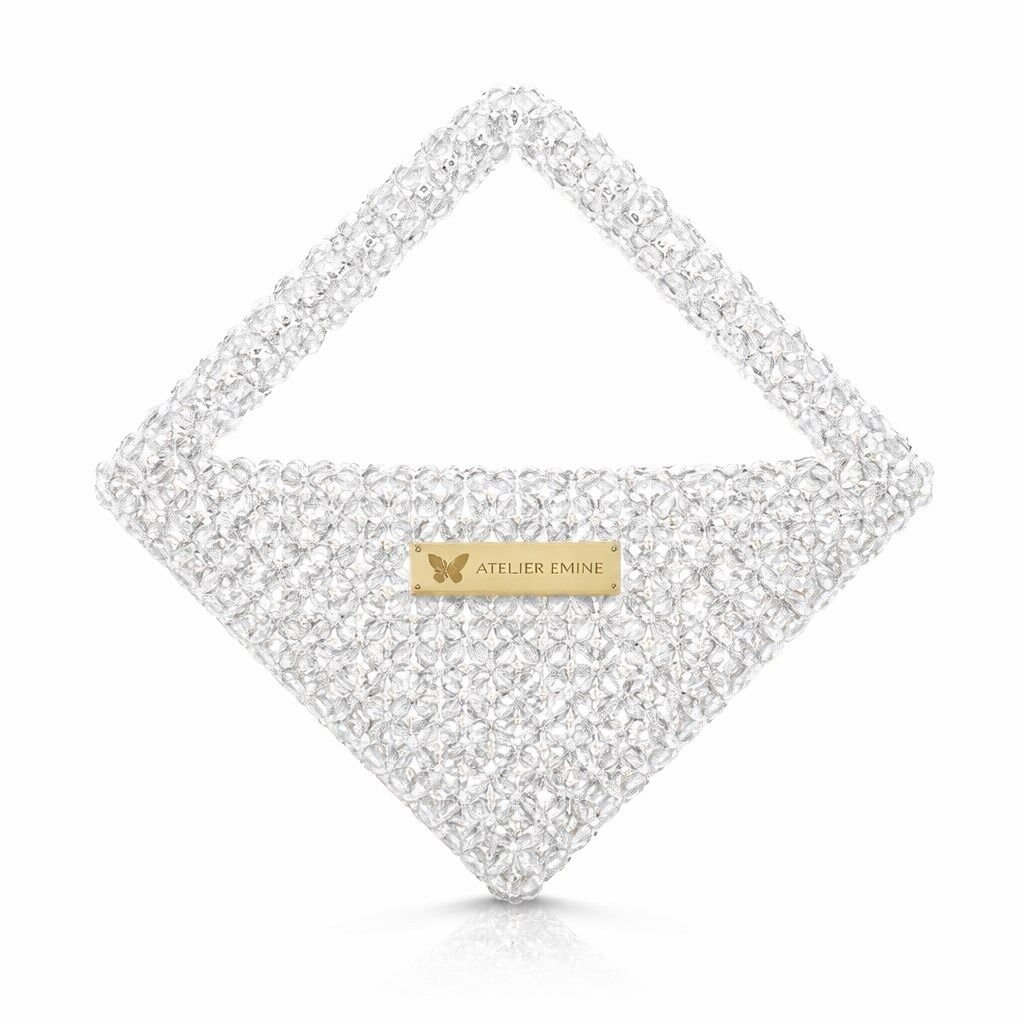 Atelier Emine’in Crystal Gelato Couture serisine ait bu tasarım; 8 mm optik sınıfı kristal boncuklar kullanılarak, tamamen el işçiliğiyle üretilmiş geometrik formlu premium mini çanta modelidir.