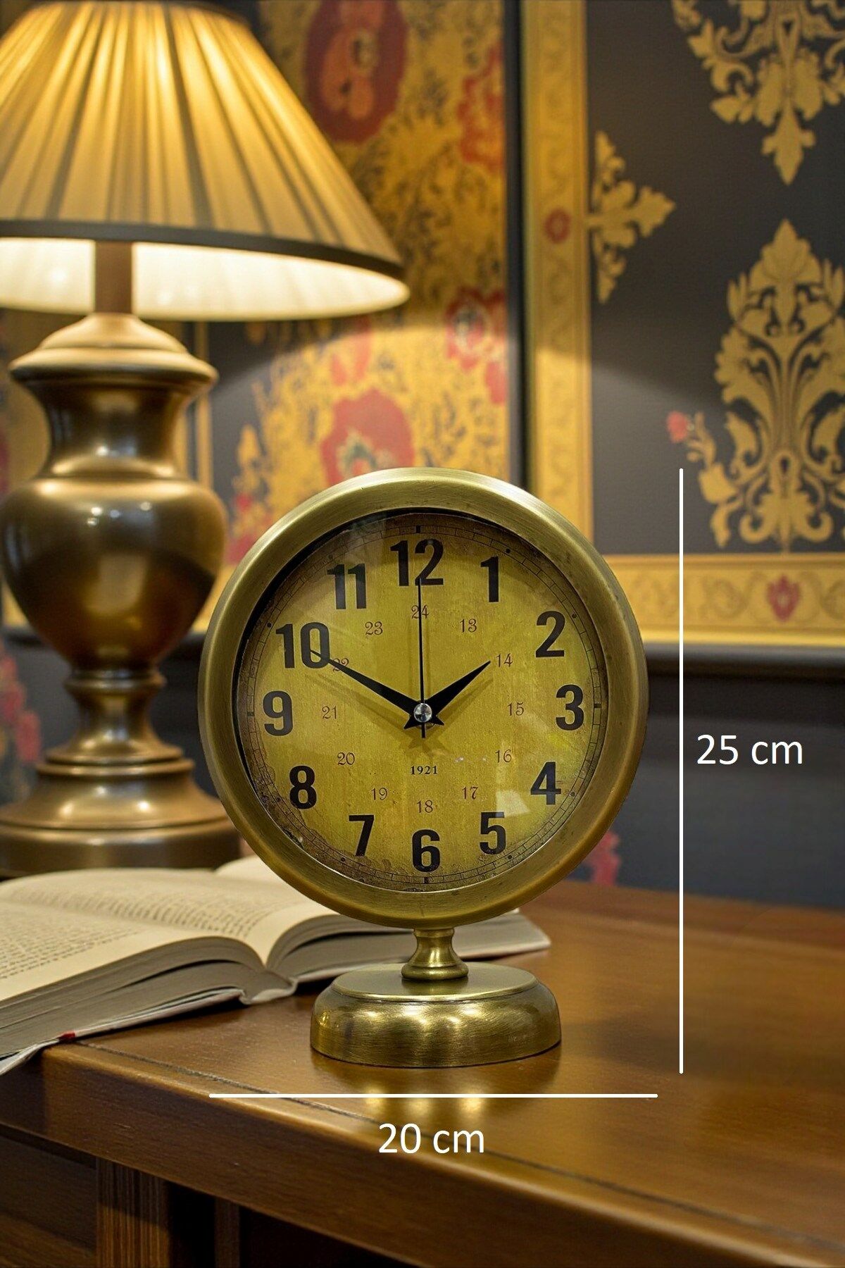 Klasik saat tasarımından ilham alan bu eskitme vintage masa saati, özel kadran yapısı ve 24 saat göstergesiyle diğer masa saatlerinden ayrılır. Sarı tonlu eskitme kadranı, siyah rakamları ve retro detayları sayesinde nostaljik bir görünüm sunarken; zamansız tasarımıyla bulunduğu ortama karakter kazandırır.