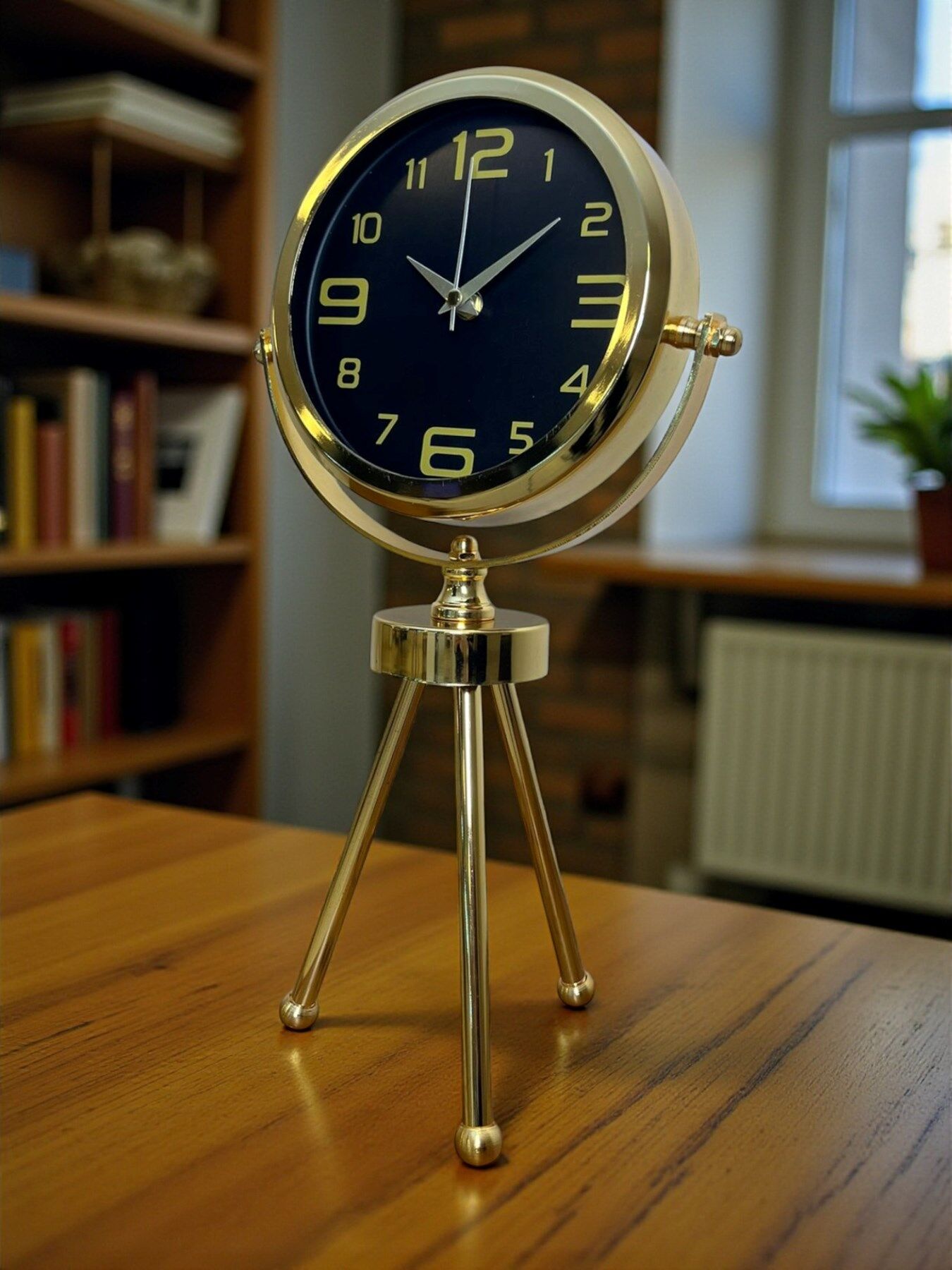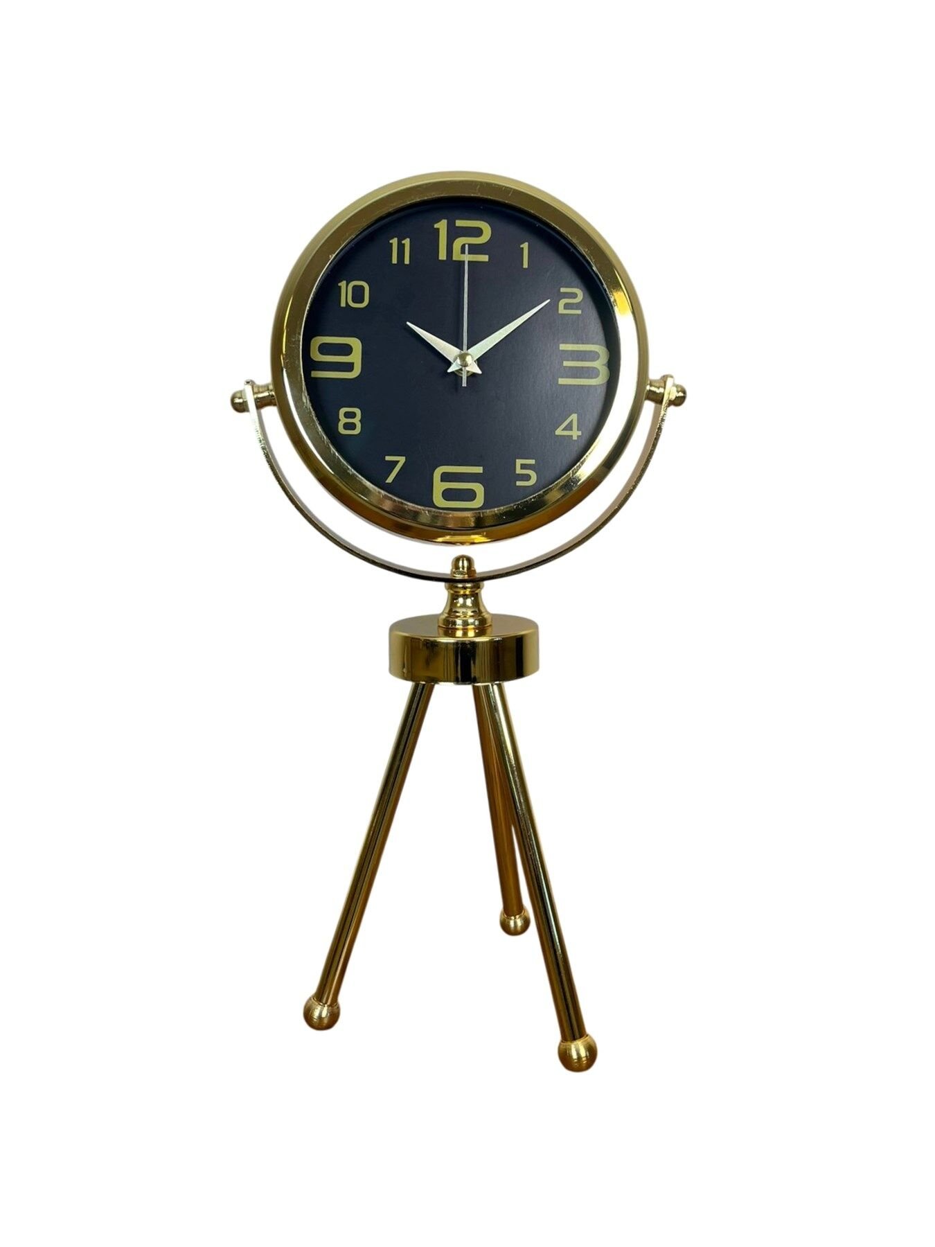 Üç ayaklı tripod yapısı, saatin dekoratif şıklığını artırırken aynı zamanda dengeli ve sağlam bir duruş sağlar. Gold metal yüzey, ışıkla birleştiğinde mekâna lüks bir atmosfer katar. Hem işlevsel bir masa saati hem de dekoratif bir obje olarak dikkat çeker.