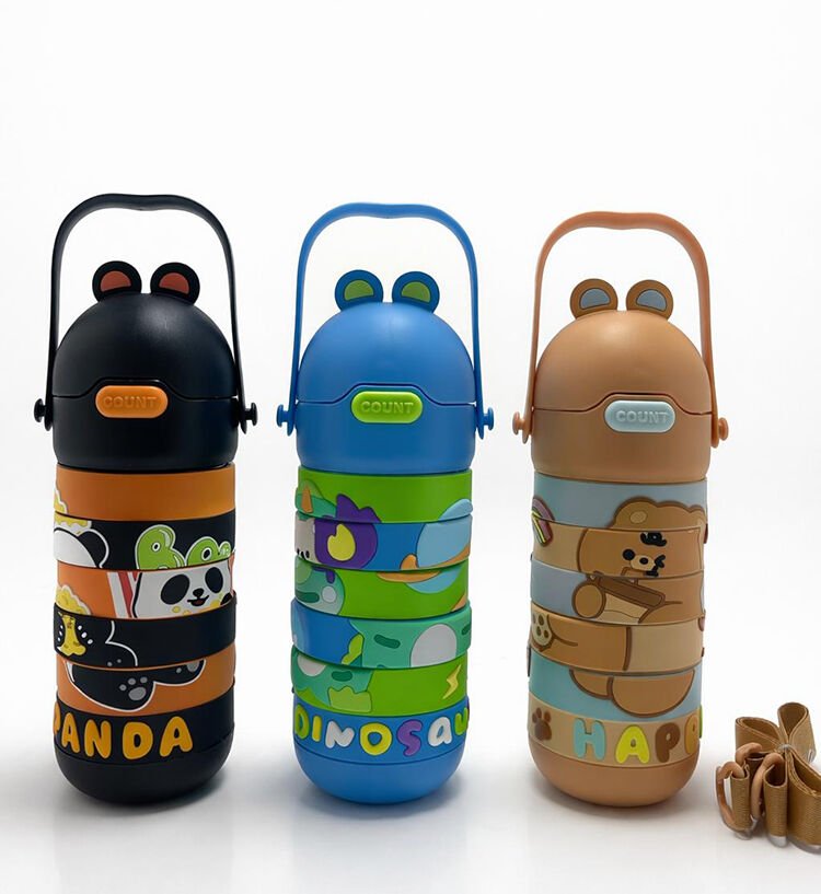 Çocuklar için su içmek artık hem bir oyun hem de bir keşif süreci! Yapboz Tasarımlı Çocuk Termosu, gövdesinde yer alan hareketli yapboz halkaları sayesinde miniklerin el becerilerini ve hayal güçlerini geliştirirken su içme alışkanlığını eğlenceli hale getirir. 24x7 cm boyutlarındaki bu fonksiyonel suluk, yüksek kaliteli paslanmaz çelik iç haznesi ile içeceklerin ısısını uzun süre muhafaza eder. Gövdedeki halkalar döndürülerek sevimli hayvan figürleri ve desenler tamamlanabilir. Hijyenik silikon pipetli ve kilitli kapak mekanizması sızdırmazlık sağlarken, özel taşıma askısı sayesinde okulda, parkta veya seyahatlerde kolaylık sunar. Hem dayanıklı bir matara hem de yaratıcı bir oyuncak olan bu termos, çocukların yanından ayırmak istemeyeceği bir yol arkadaşı olacak.