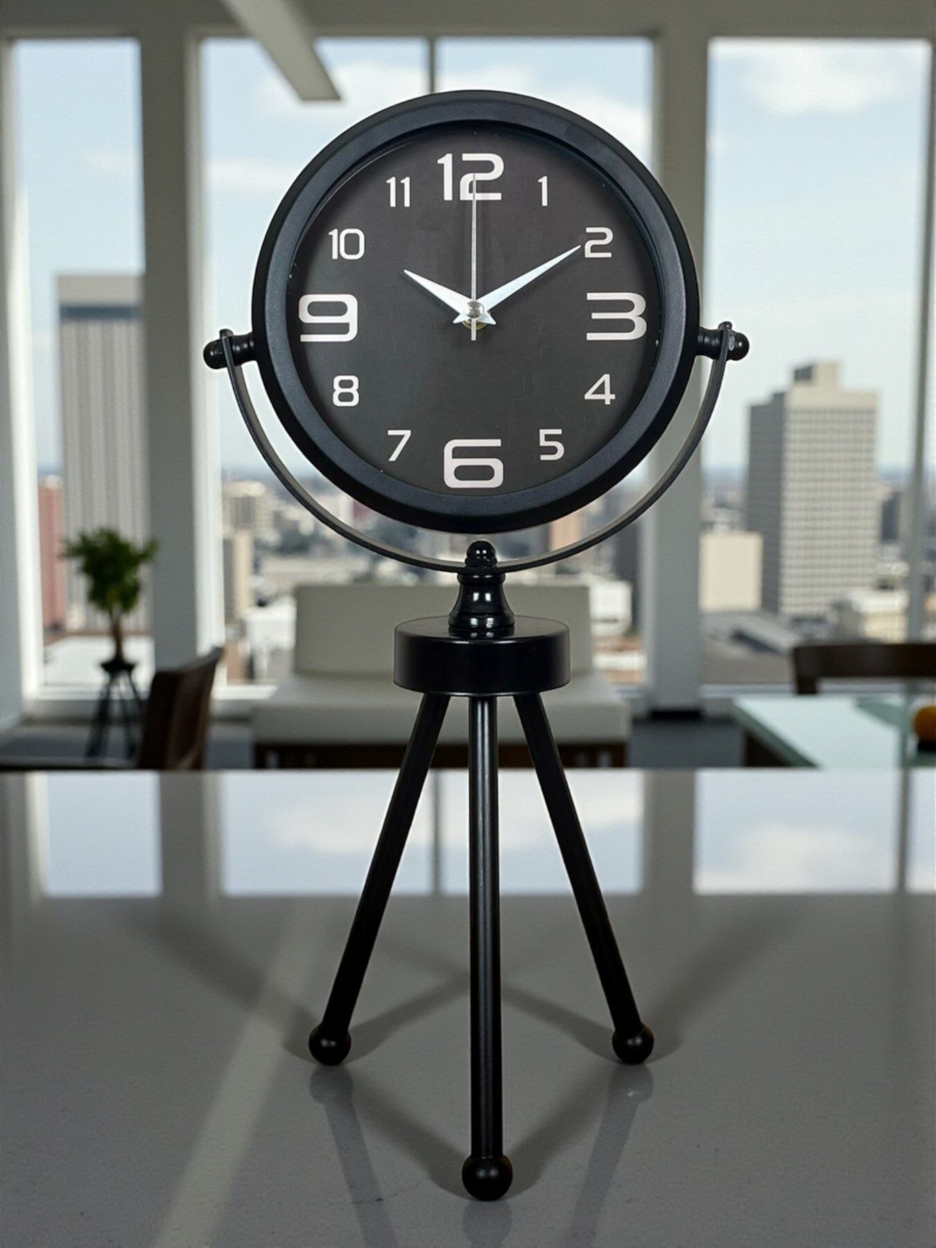 45 x 25 cm ölçülerindeki bu modern siyah üç ayaklı masa saati, minimal tasarımı ve güçlü duruşuyla her ortama şıklık katar. Gerçek cam korumalı kadranı sayesinde net görüntü ve uzun ömürlü kullanım sağlar. Tamamen metal gövdesi ve tripod ayak yapısıyla sağlam, dekoratif ve premium bir görünüm sunar. Sessiz akar saniye mekanizmasıyla ev, ofis ve çalışma alanlarında rahatsızlık vermeden kullanılabilir.